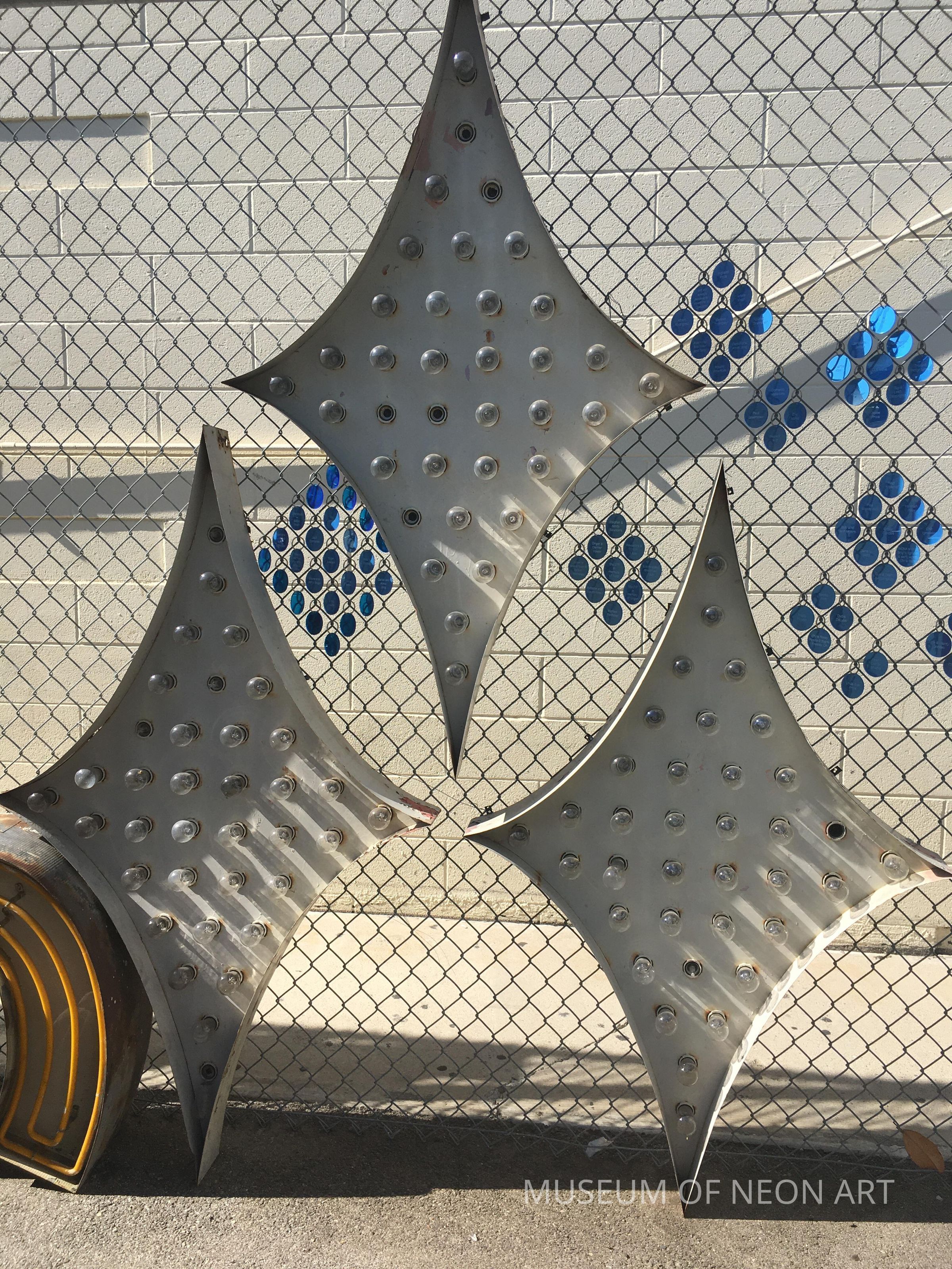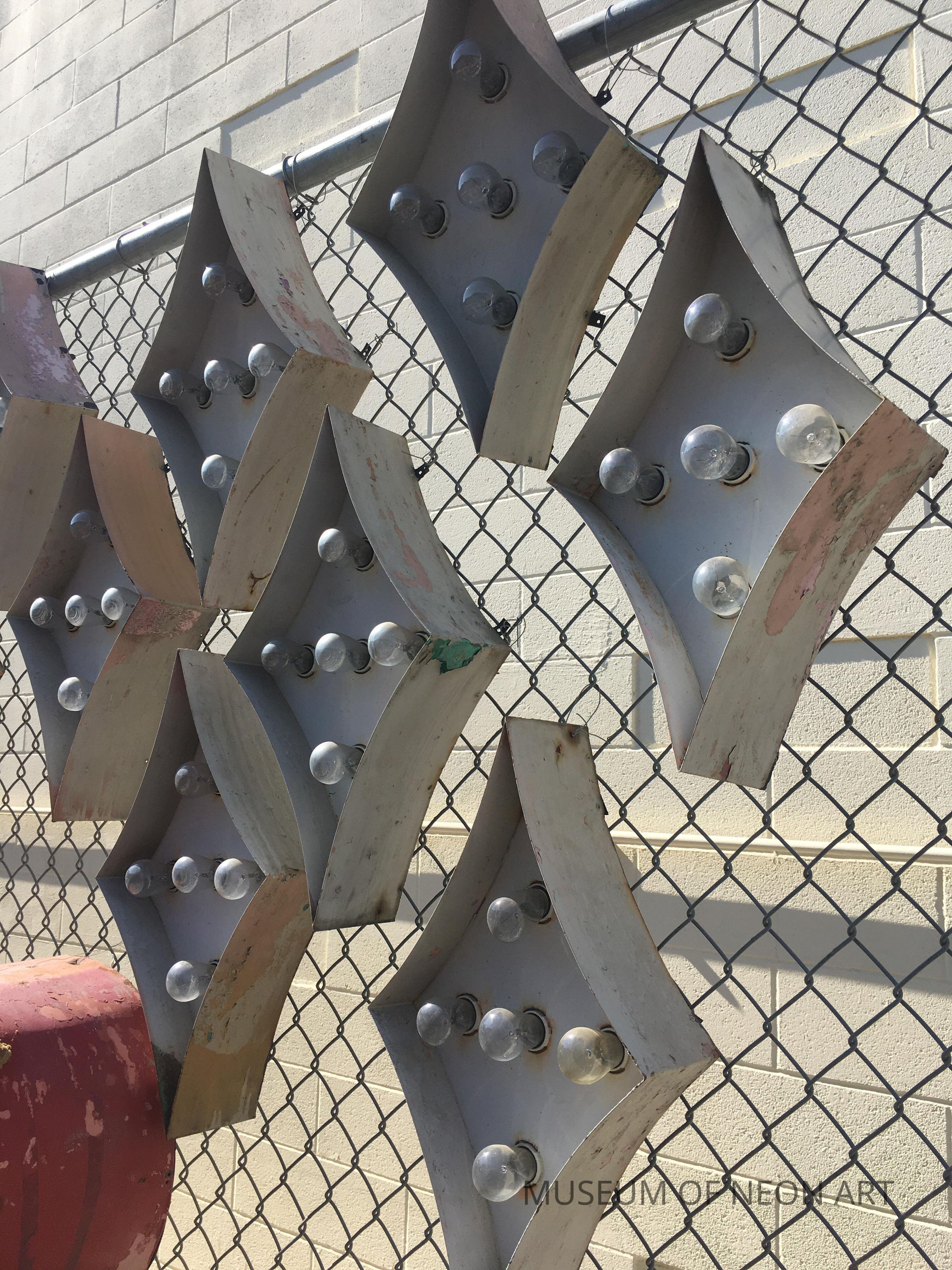 Small and large diamond-shaped bulb signs from the Movieland Wax Museum at 7711 Beach Blvd. in Buena Park, CA. Closed 2005; sign removed 2018.