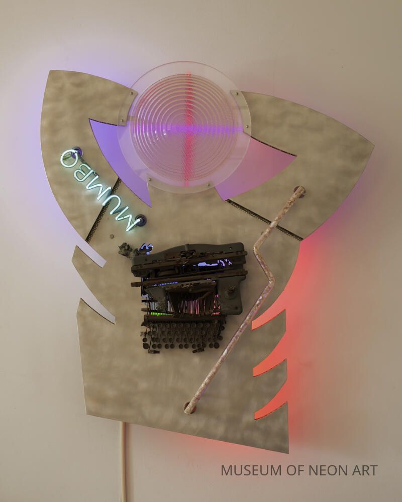 Backlit abstract metal figure with typewriter, crackle tube, neon argon tube. Similar to "Ace of Hearts" piece in MONA's collection. Text: "MUMBO"