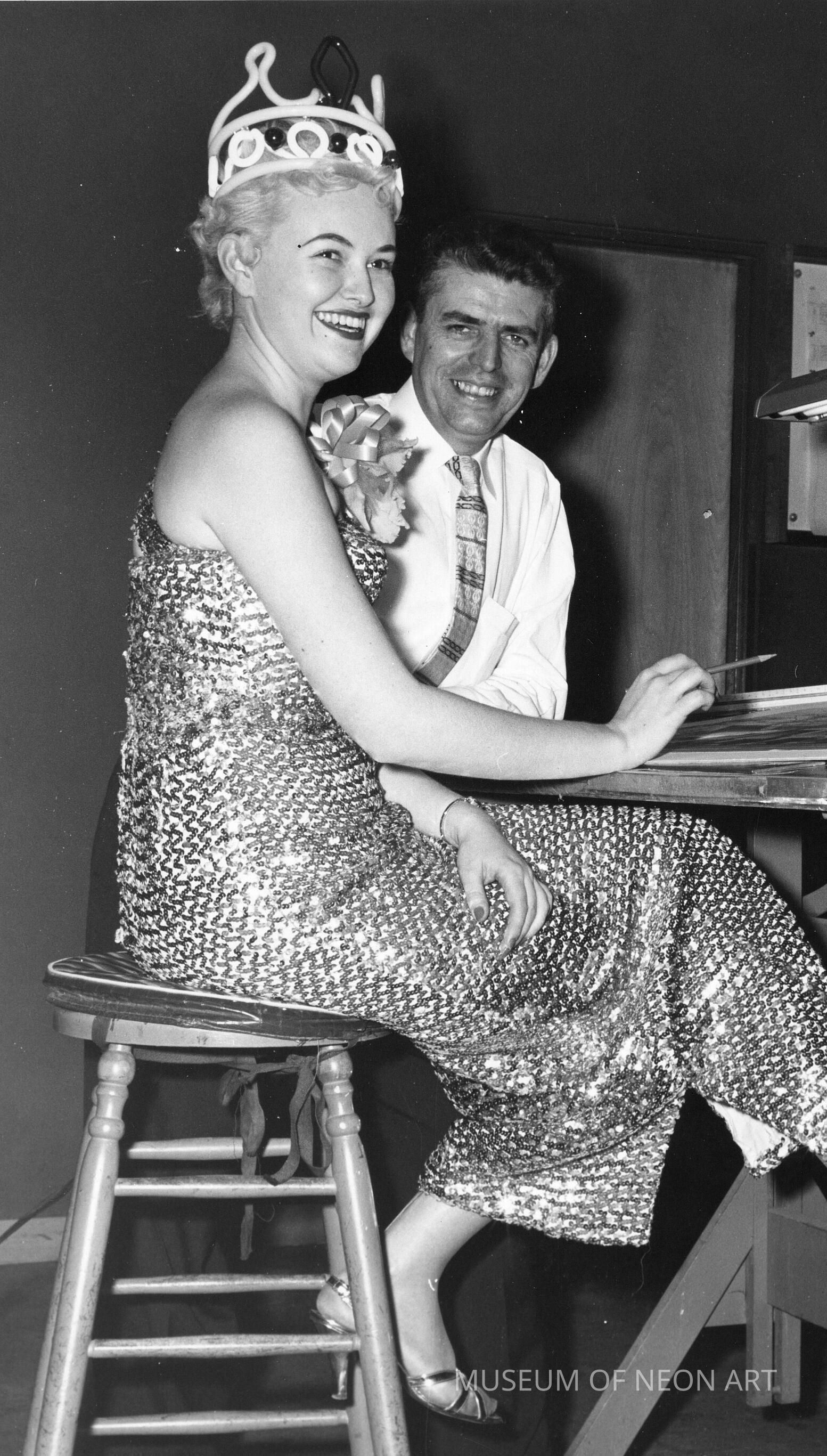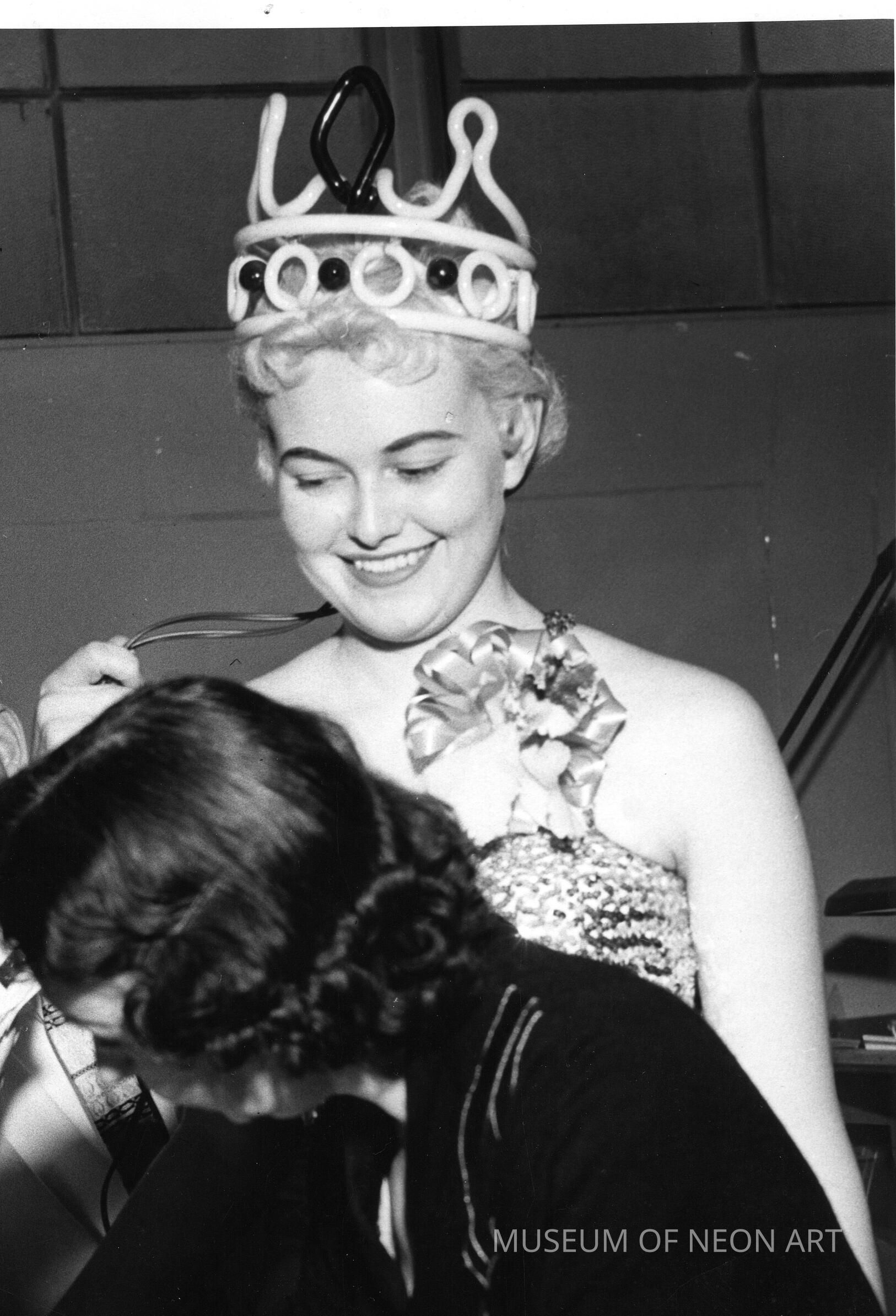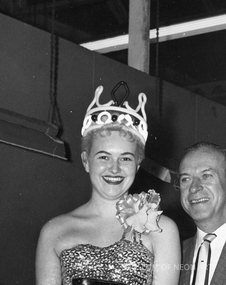 Rare original black-and-white photographs of the Neon Queen in a crown made of neon tubing.