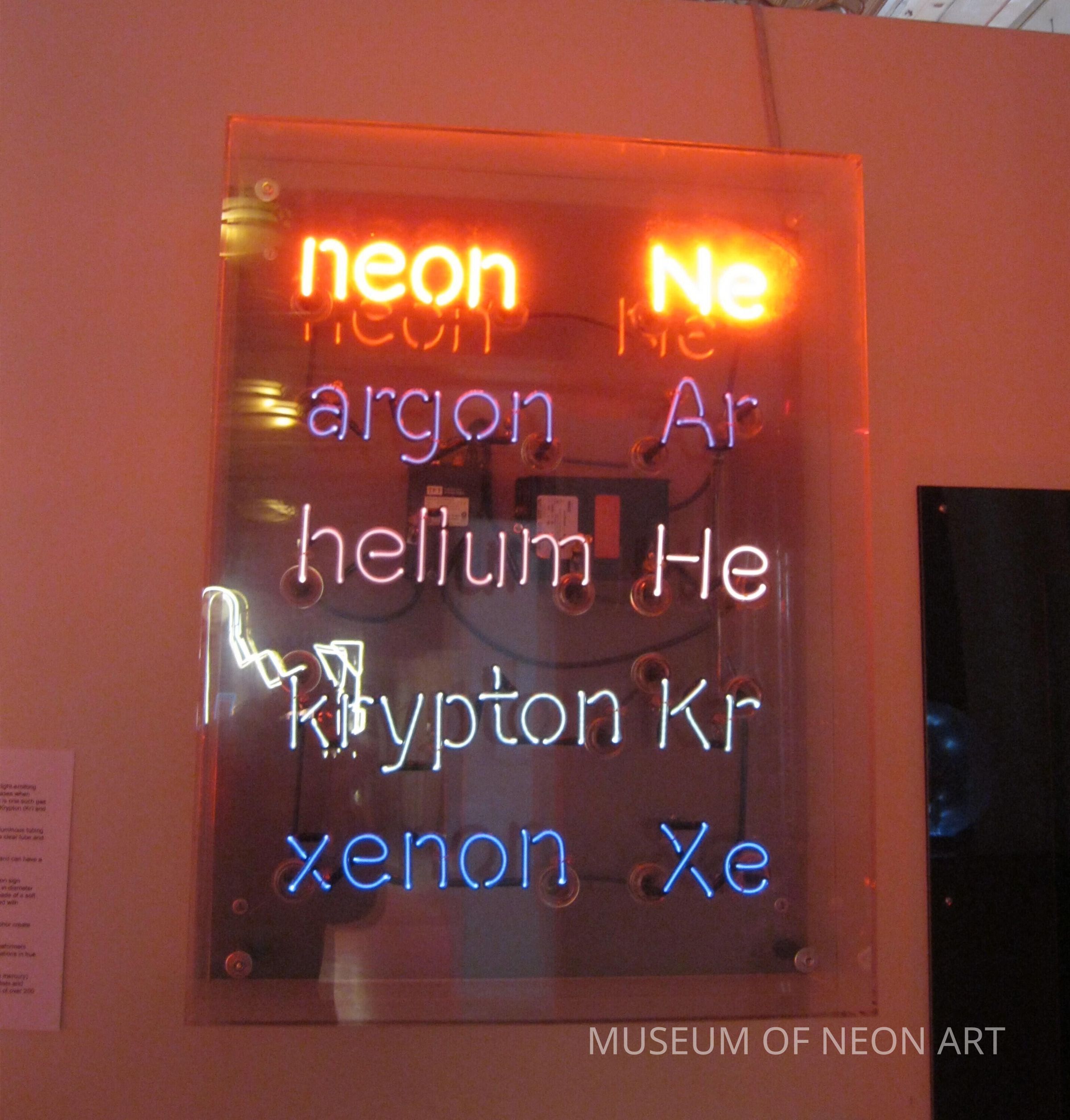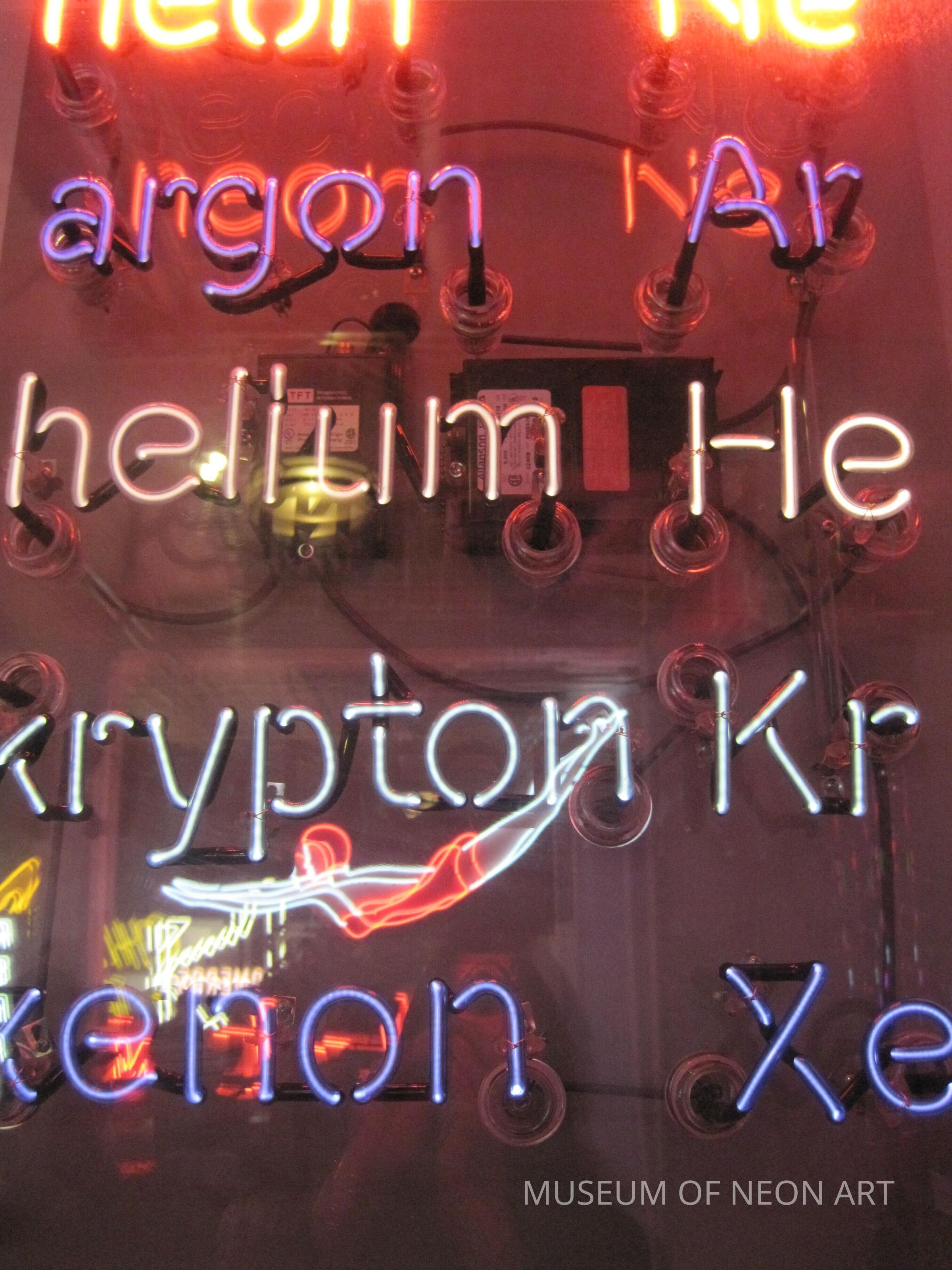 In this educational display, each word is pumped with its corresponding gas. The tubes themselves are clear, meaning that we can see the pure color of each electrified element. Neon glows bright red, Argon shines a pale lavender, Helium makes a peachy white, Krypton shines silvery white, and Xenon glows blue or bright white. Neon artists can create a myriad of colors like bright green and yellow through using colored glass or phosphor-coated glass.