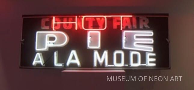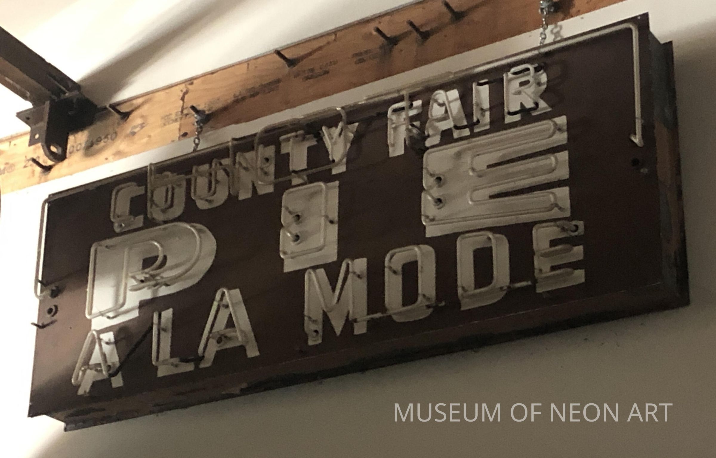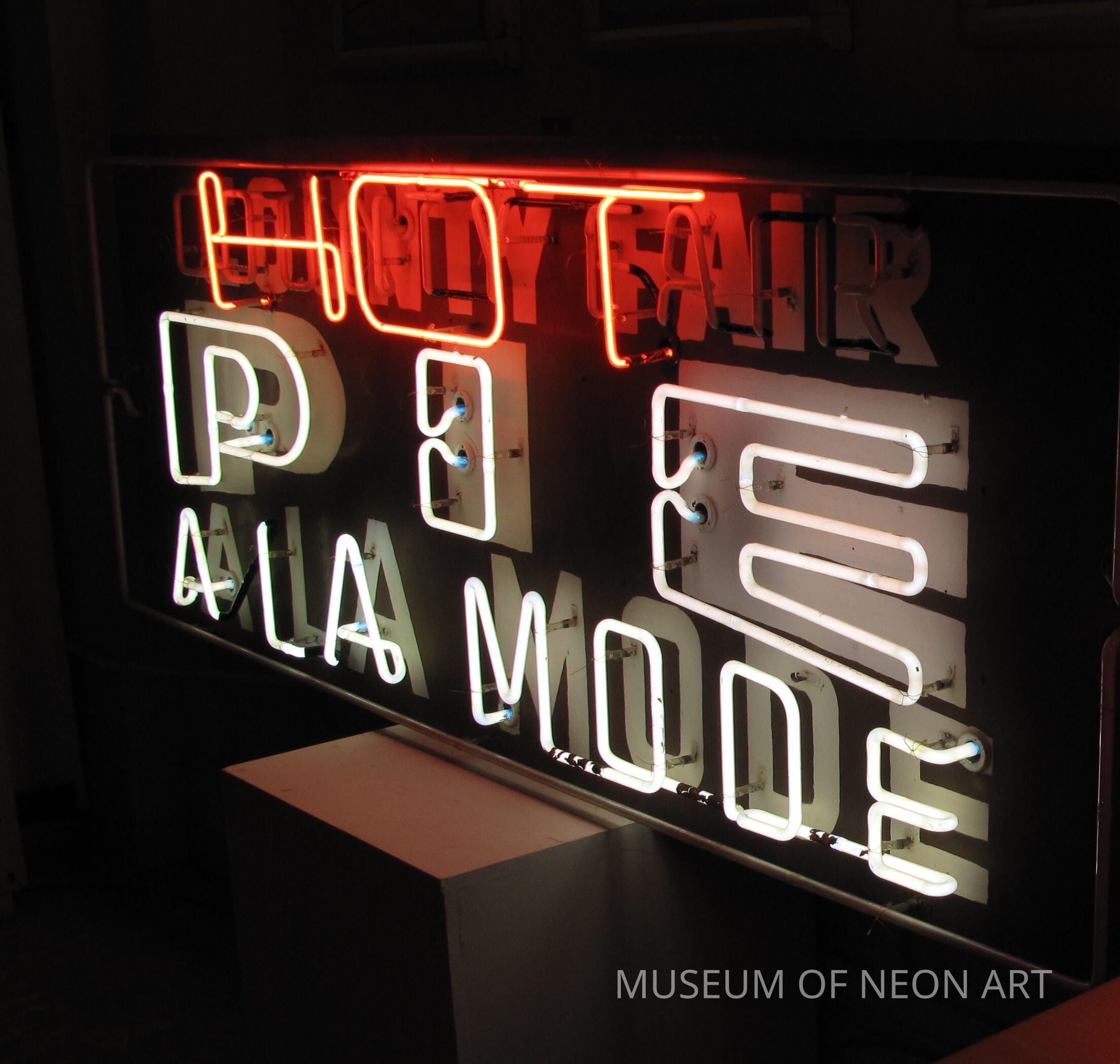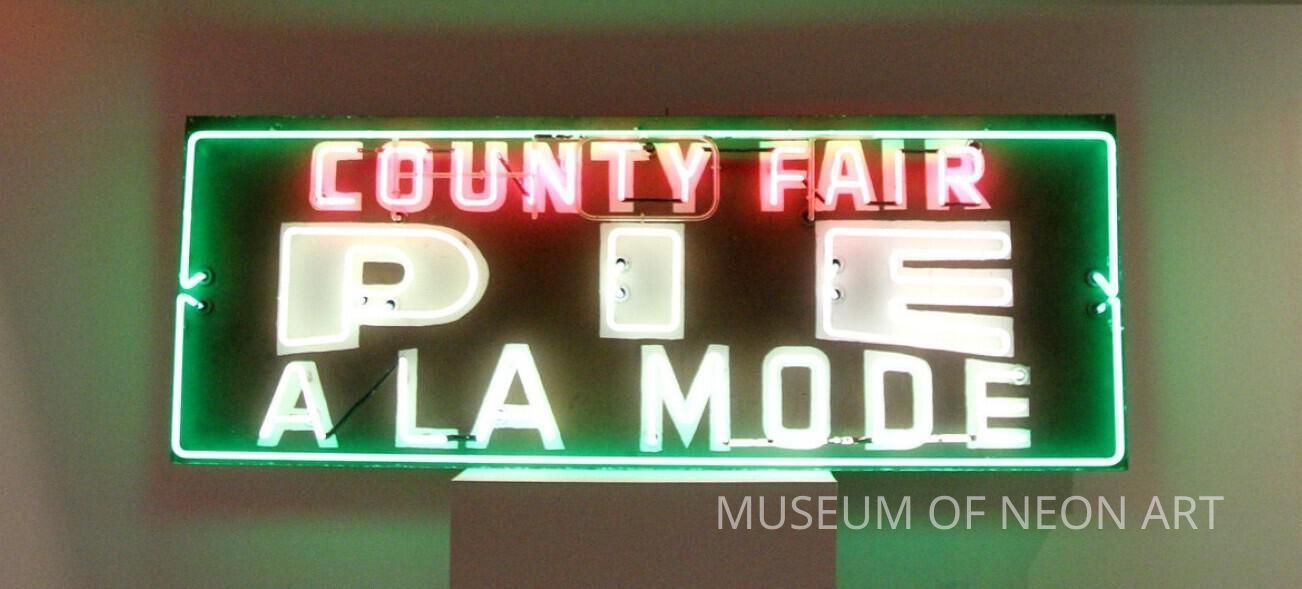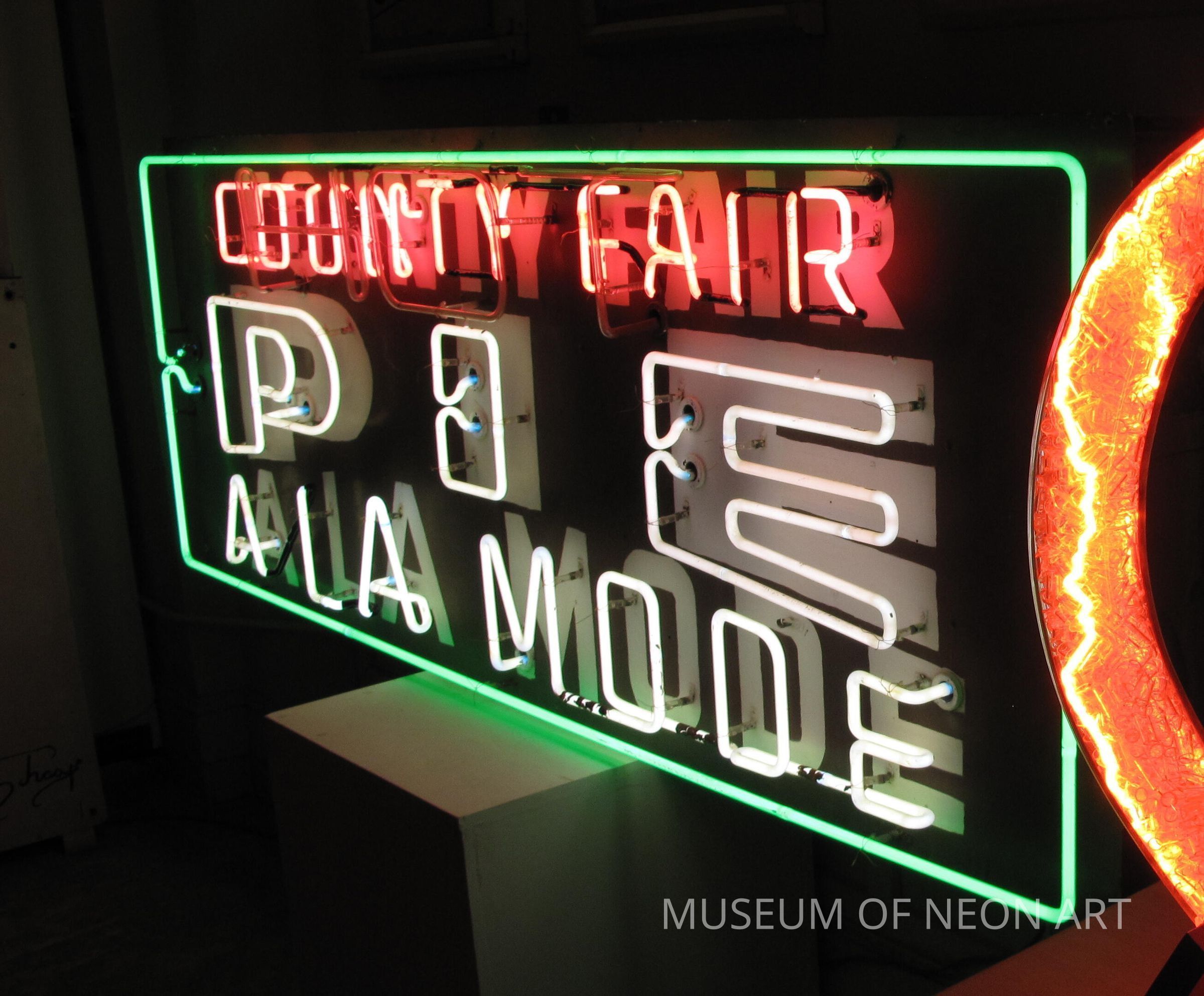Part of a series of permanent, freestanding Los Angeles County Fair buildings, this beloved mom-and-pop pie shop closed its doors in 1999 and was soon after demolished. Located just footsteps away from the famous Ernie’s Bar-B-Q eatery and neon pig-chef sign, this pie shop was part of a festive, neon-lit food court at the Fair.