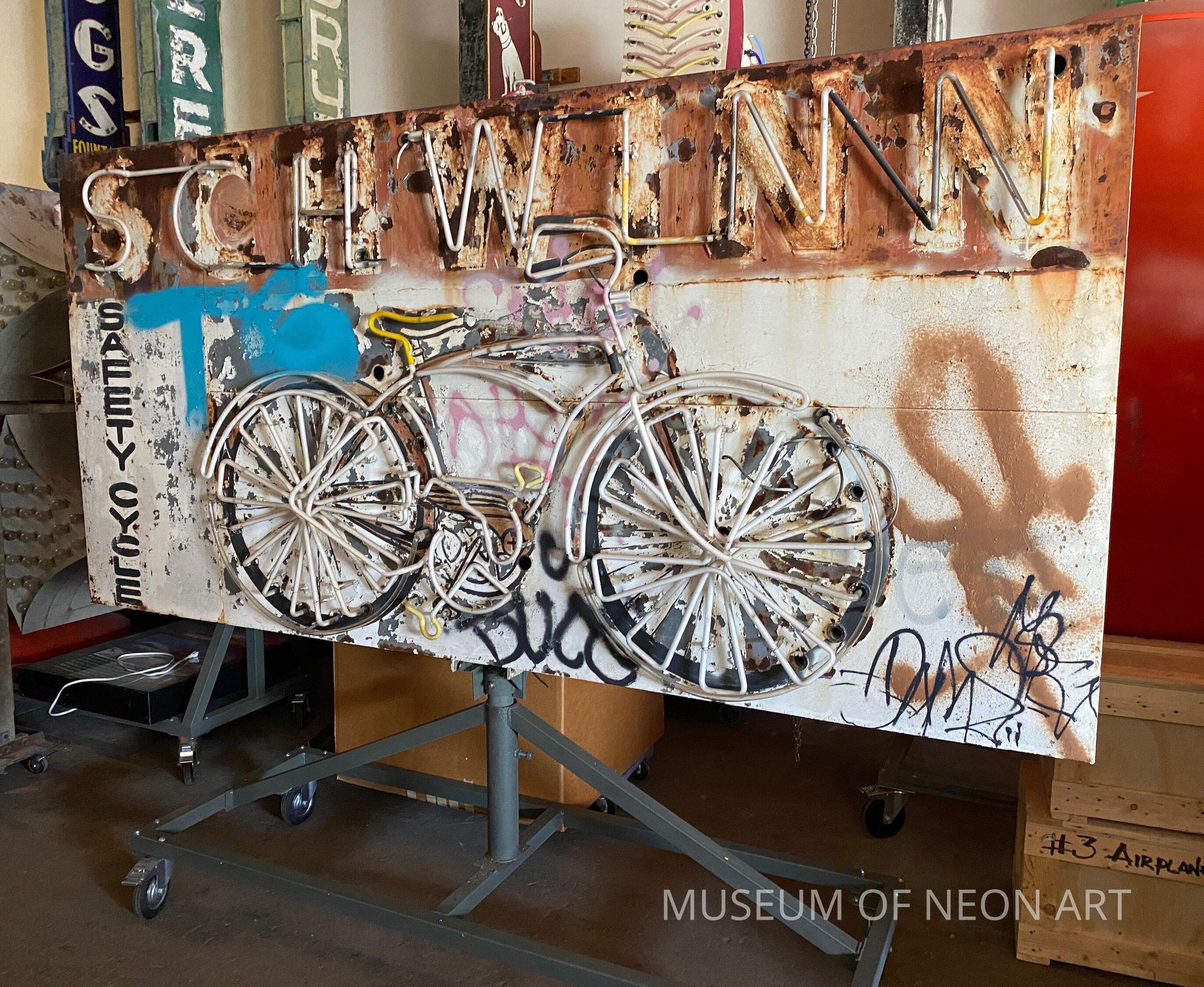 Animated bicycle sign with spinning wheels from the rooftop of Safety Cycle, 1014 N. Western Ave, Los Angeles.