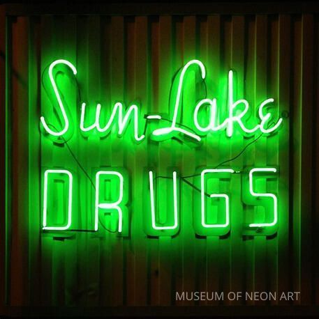 The use of the word “Drugs” in the Sun-Lake sign demarks a changing era and adds to the sign’s rarity and importance in the Museum of Neon Art’s collection. In the 1950s, the word “Drugs” still had a positive, healthful connotation, but that did not survive the following decade. The youth culture of the 1960s diluted the word in a new climate of drug use and abuse. Across the nation, drug stores slowly changed their identities to become pharmacies and lose the word “Drugs.” The neon signs from the Matlow family’s Sun-Lake drug store are rare survivors and represent a changing era.