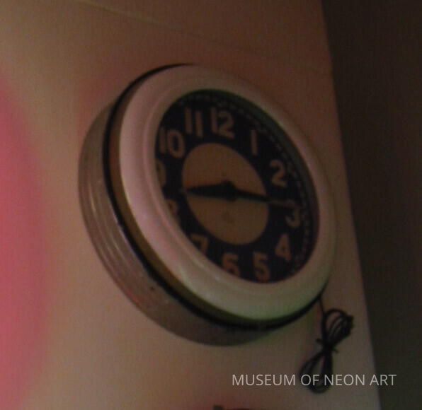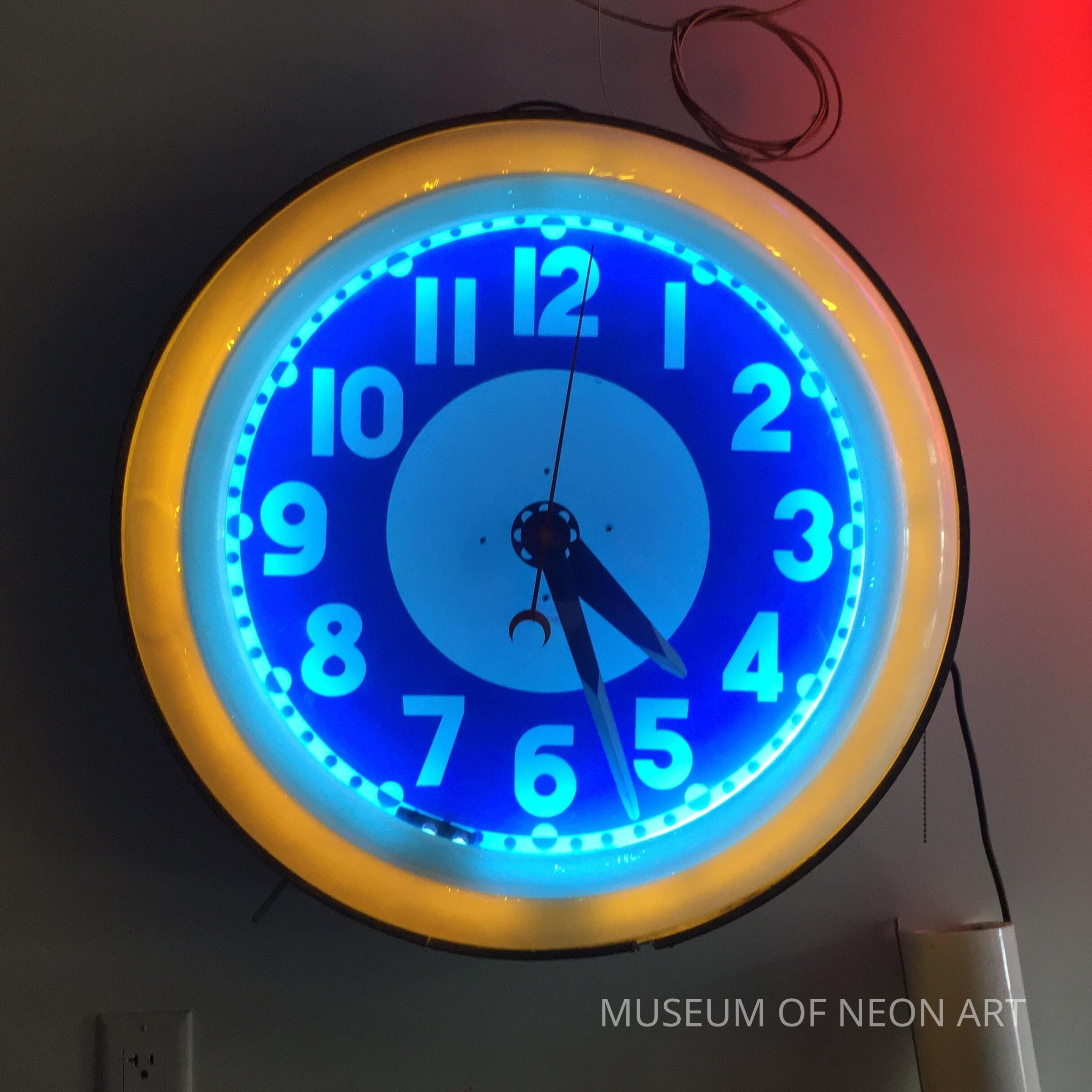 This is a 34" blue and yellow neon clock with a silver case. Built by the Neon Clock Company of New York City, New York, it was found in Savage, Maryland in 1984 by Jay Simmons. This clock is awaiting the restoration of the words "Time to Eat."