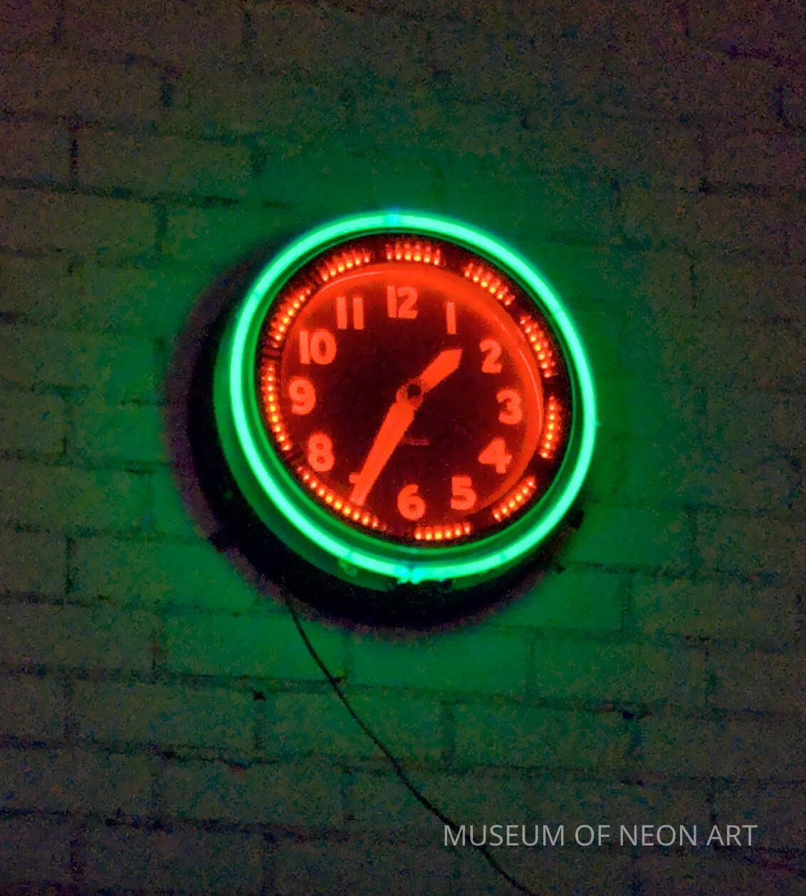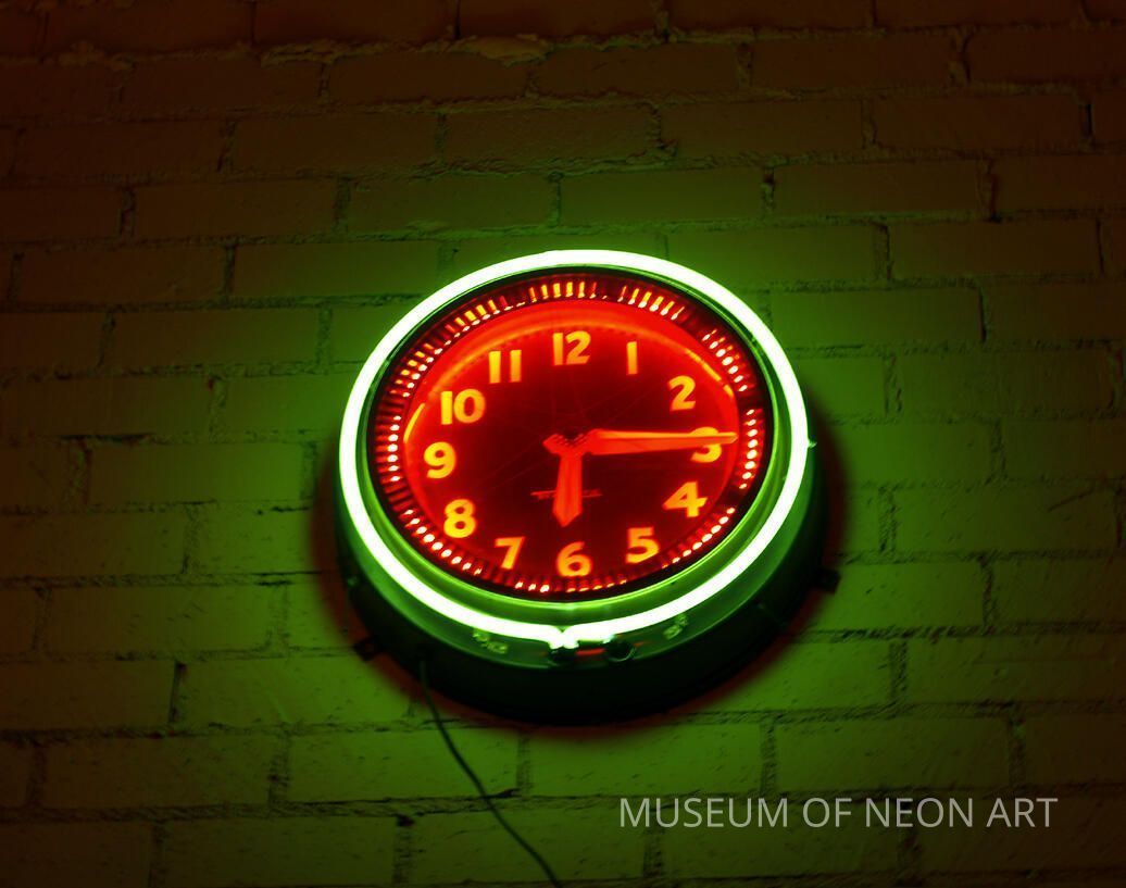 This is a 25" orange and green neon rotor clock in a blue painted case. Found in downtown Los Angeles in 1978 by Jay Simmons and Steve Oliphant.