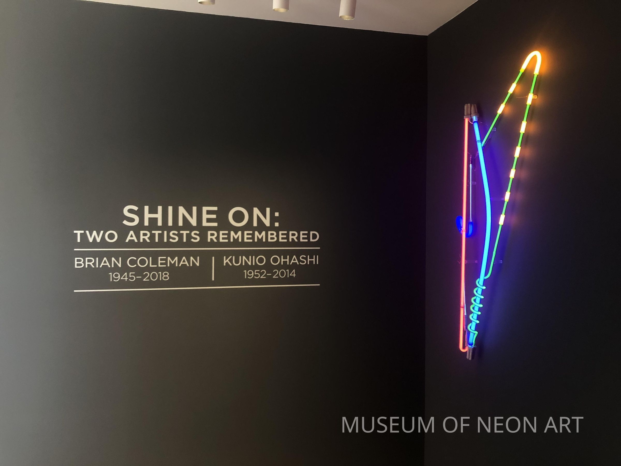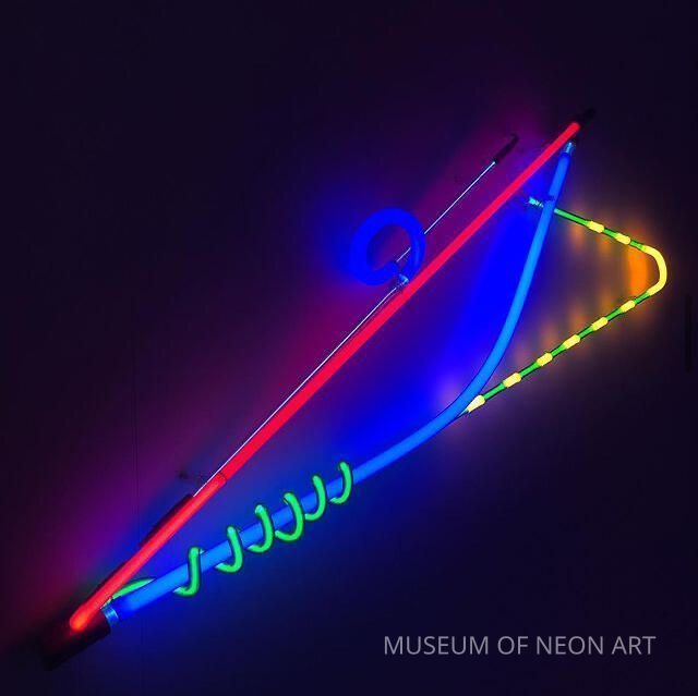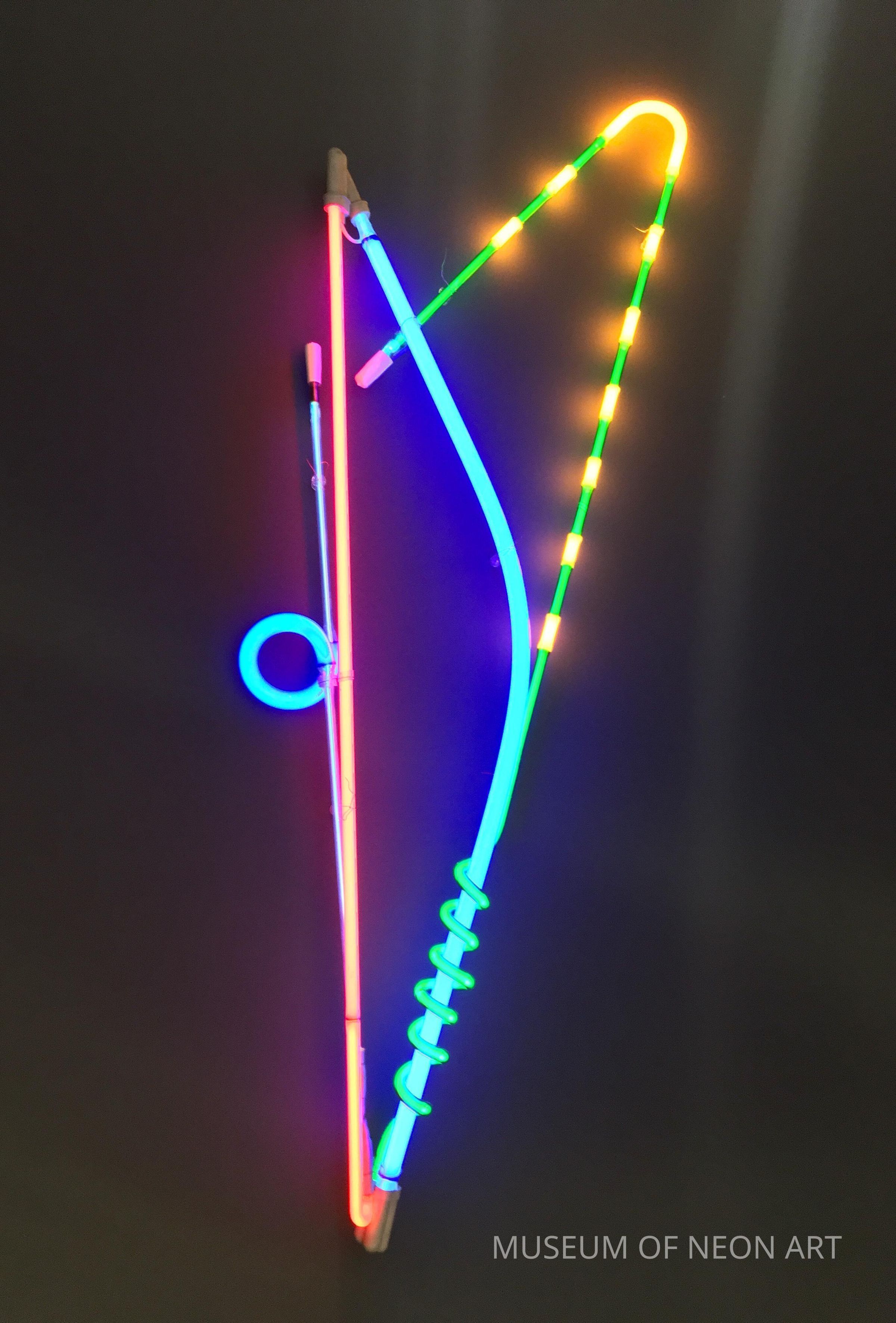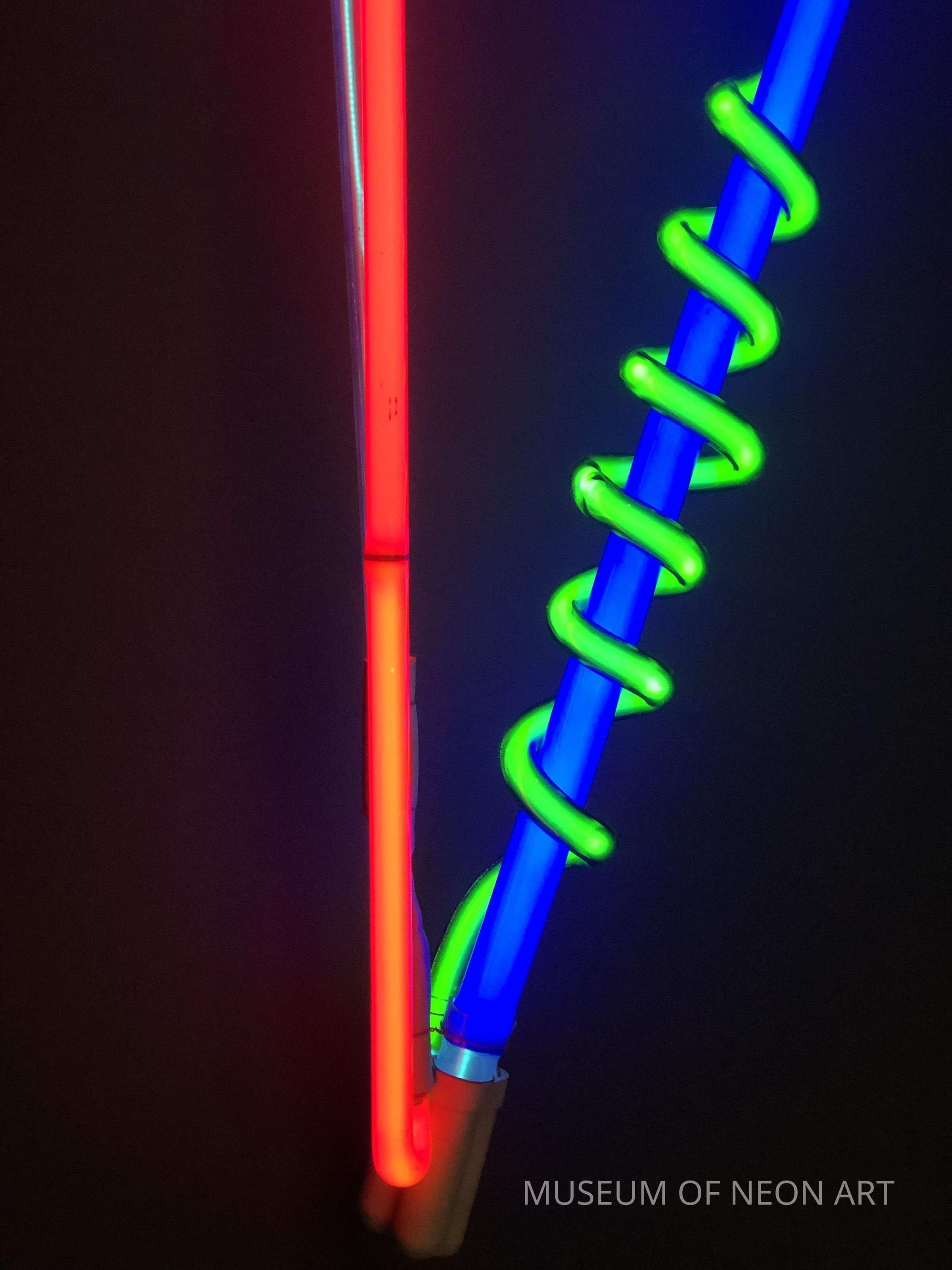 Brian Coleman is known for his exploration of color and volume in luminous tubing. This art piece demonstrates his skills in splicing and bonding glass of different circumferences together. Coleman studied industrial design from Pratt Institute in the 1960s. Sometimes called “a neon artists' artist” he sought out rare vintage glass tubing from the USA and Germany that was no longer produced, as opposed to clear or phosphor coated tubes, which are more common in the United States. Much of the glass he used was produced in the early 1940s. Coleman’s work was exhibited at Rudy Stern’s “Let There Be Neon” gallery. He produced large commissioned work and installations in France and Japan. Brian Coleman’s artist archive and works were donated to the Museum of Neon Art.Label