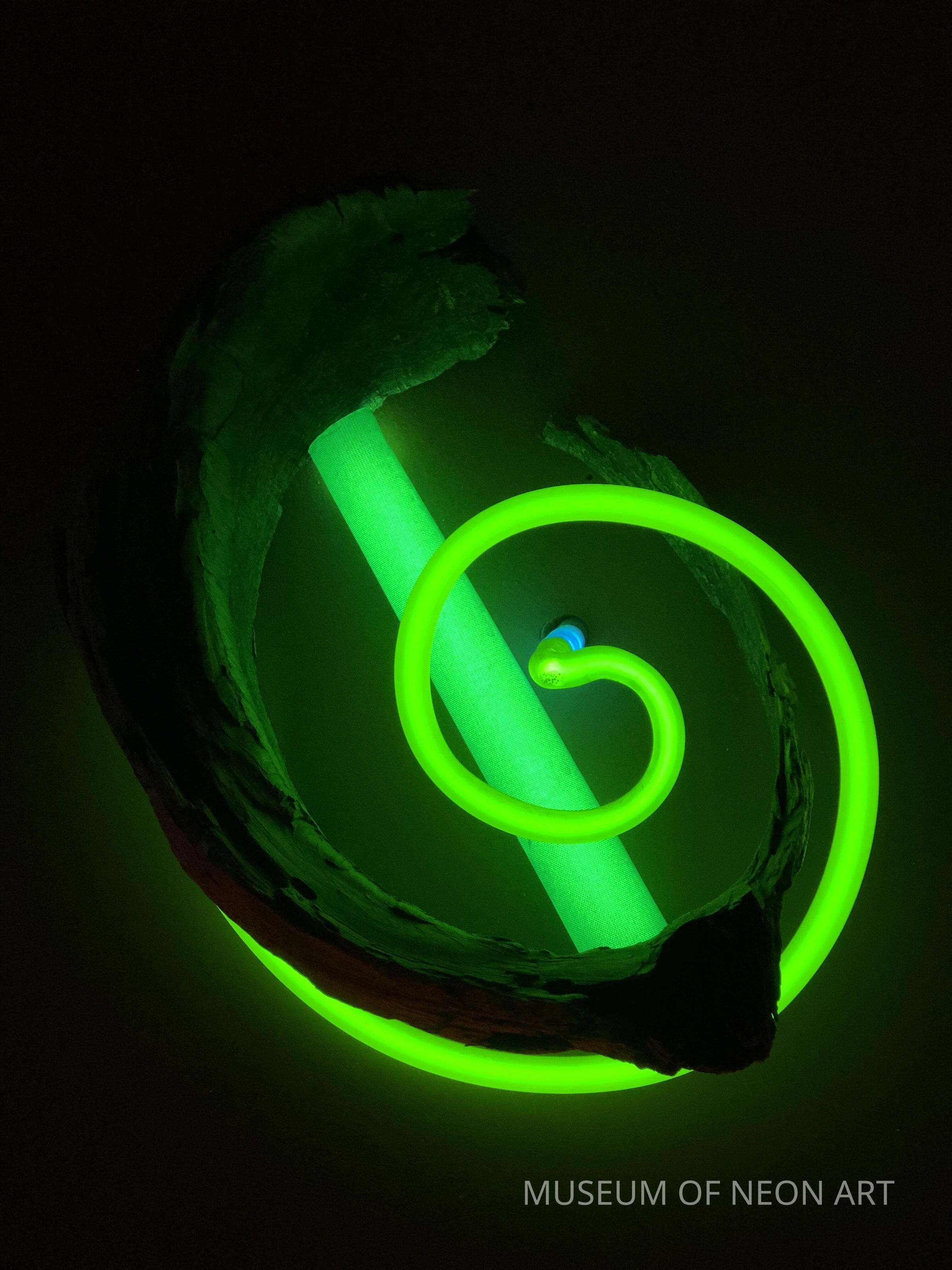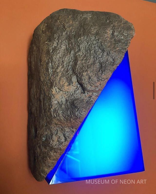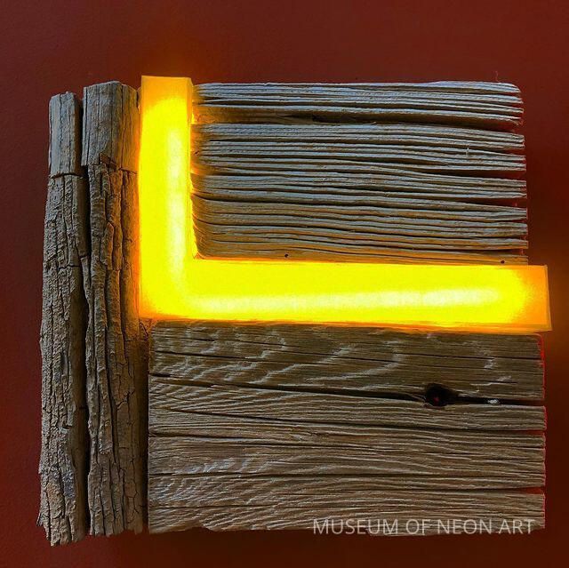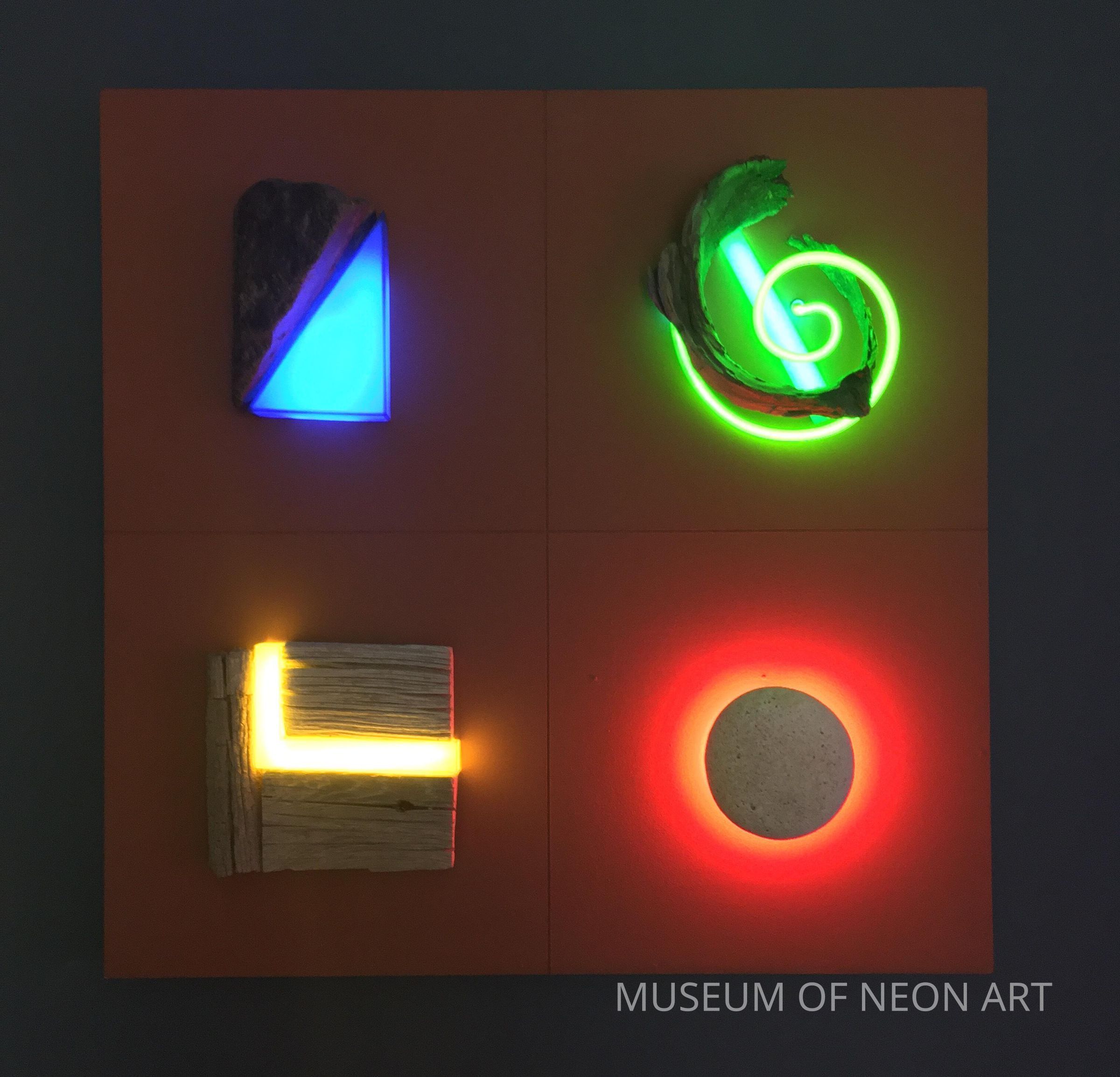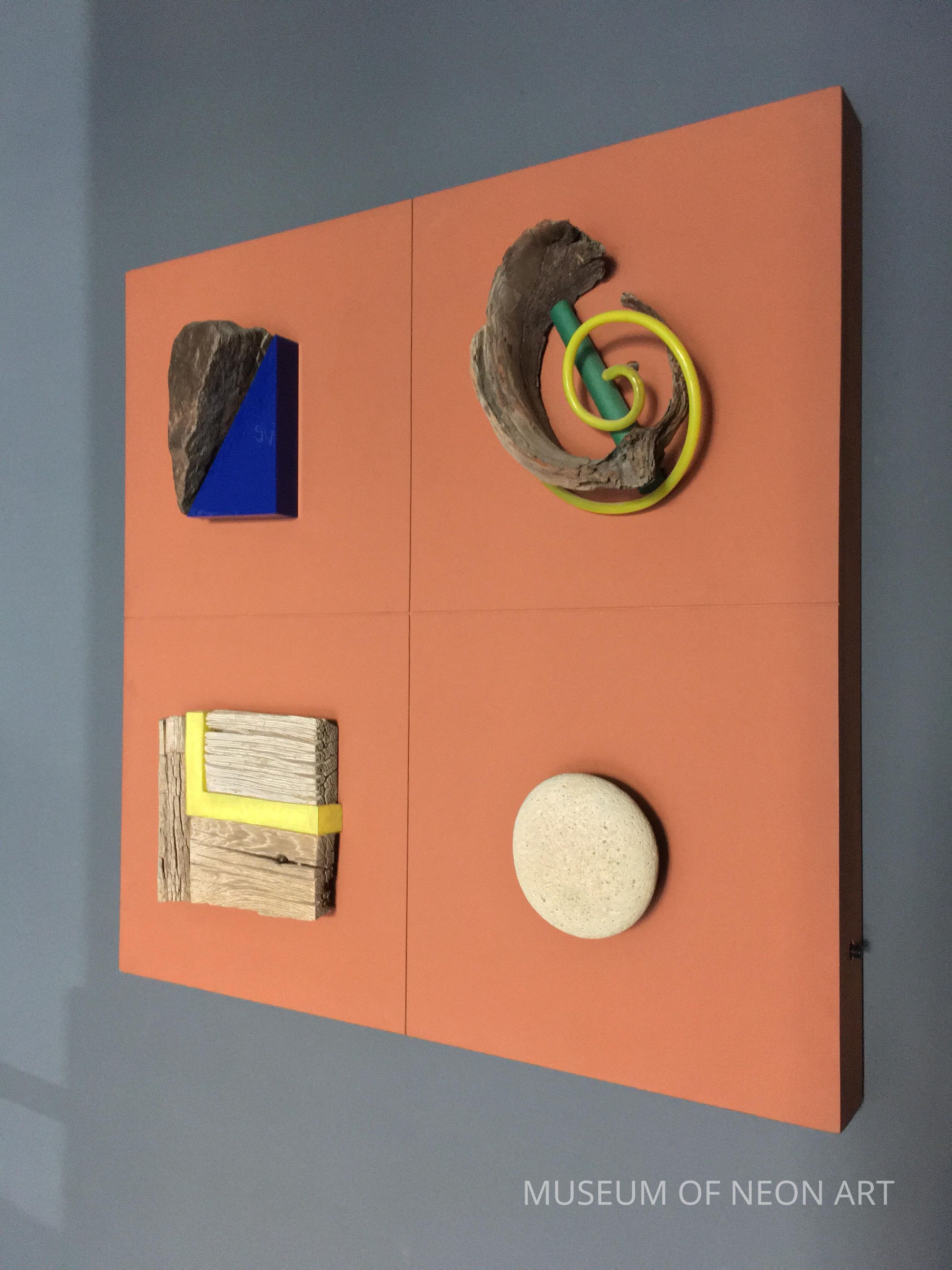 Kunio Ohashi’s work meditates upon the natural through the found and handmade object. The artist juxtaposes materials to enhance and subvert the viewer’s relationship with material. Kunio Ohashi’s work fuses found elements such as rocks and wood with neon light. He both hides and centers the neon tube, demonstrating several ways that neon can transform an object or exist independently as a sculptural form. Ohashi states, “I am interested in putting inanimate materials together with very live materials. I normally start to work with natural objects such as driftwood or stone, which I find in the desert or at the beach. I often use neon in primary colors, especially red and blue... Stone gives me energy, wood gives me a calm feeling and neon an element of surprise. I try to create art that integrates neon and any other materials in such a way that the viewer has a sense of the whole rather than its parts.” Playing with rhythm, balance, harmony, and geometry, the work employs primary and secondary colors and the structure of four squares within a single square to make a dramatic yet grounded composition.