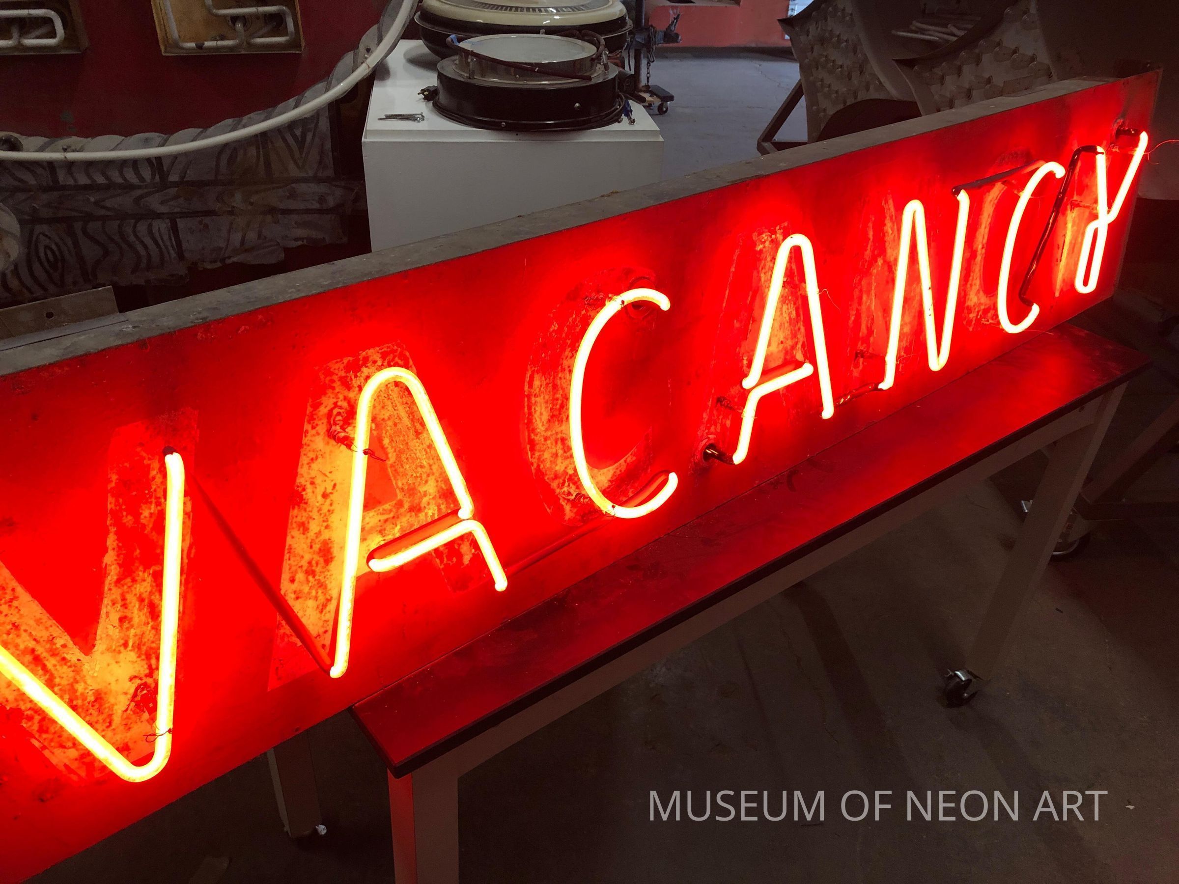 From the Bel-Air Motel in Fresno, CA. The "Walnut Room" sign from the motel is also in MONA's collection. Text: "VACANCY"