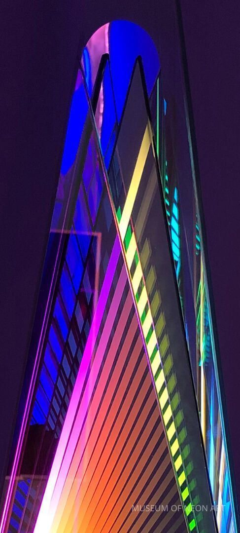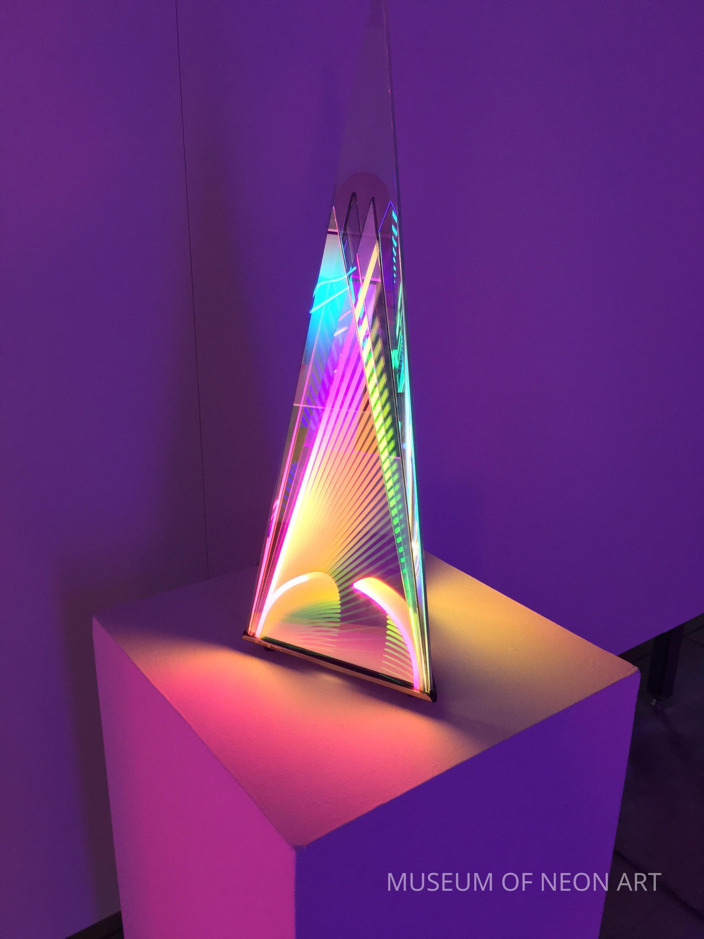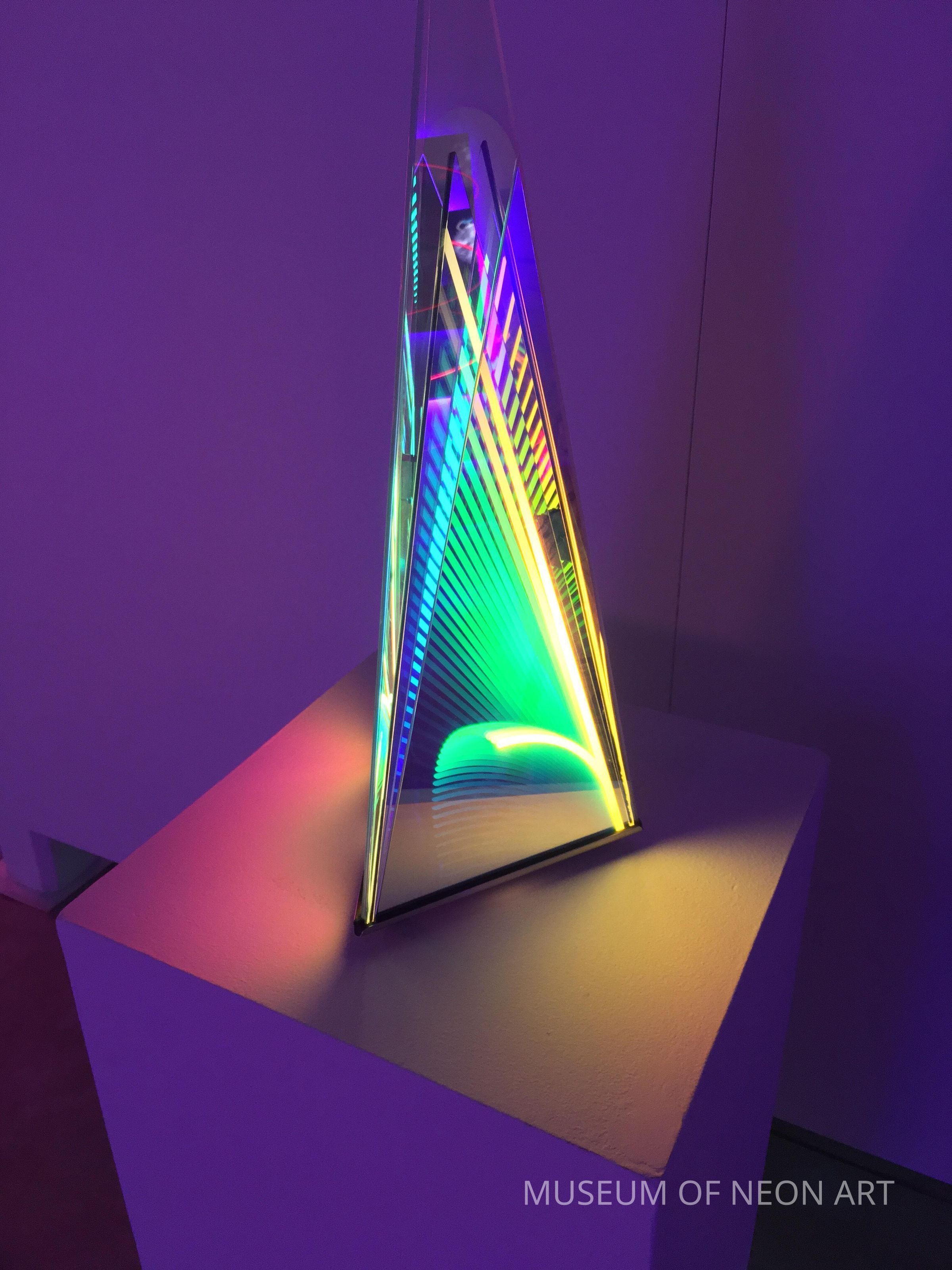 Overlapping triangles of color shift with the viewer, creating an illusionistic space. The layers and juxtaposition of types of glass creates a dynamic and abstract rainbow effect. Ray Howlett’s pioneering work in light and sculpture is in museum collections throughout the United States. Since the late 1960s, his work has been closely associated with the Light and Space movement. Howlett’s sculptural forms transform as the viewer moves around the pieces, creating, in Howlett’s words, an ”optically expanding space.” Howlett has been experimenting with electric artworks since the age of 12, and since the early 1960s, he has been using transparency to create what he calls a “push and pull of space.”