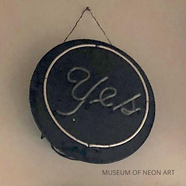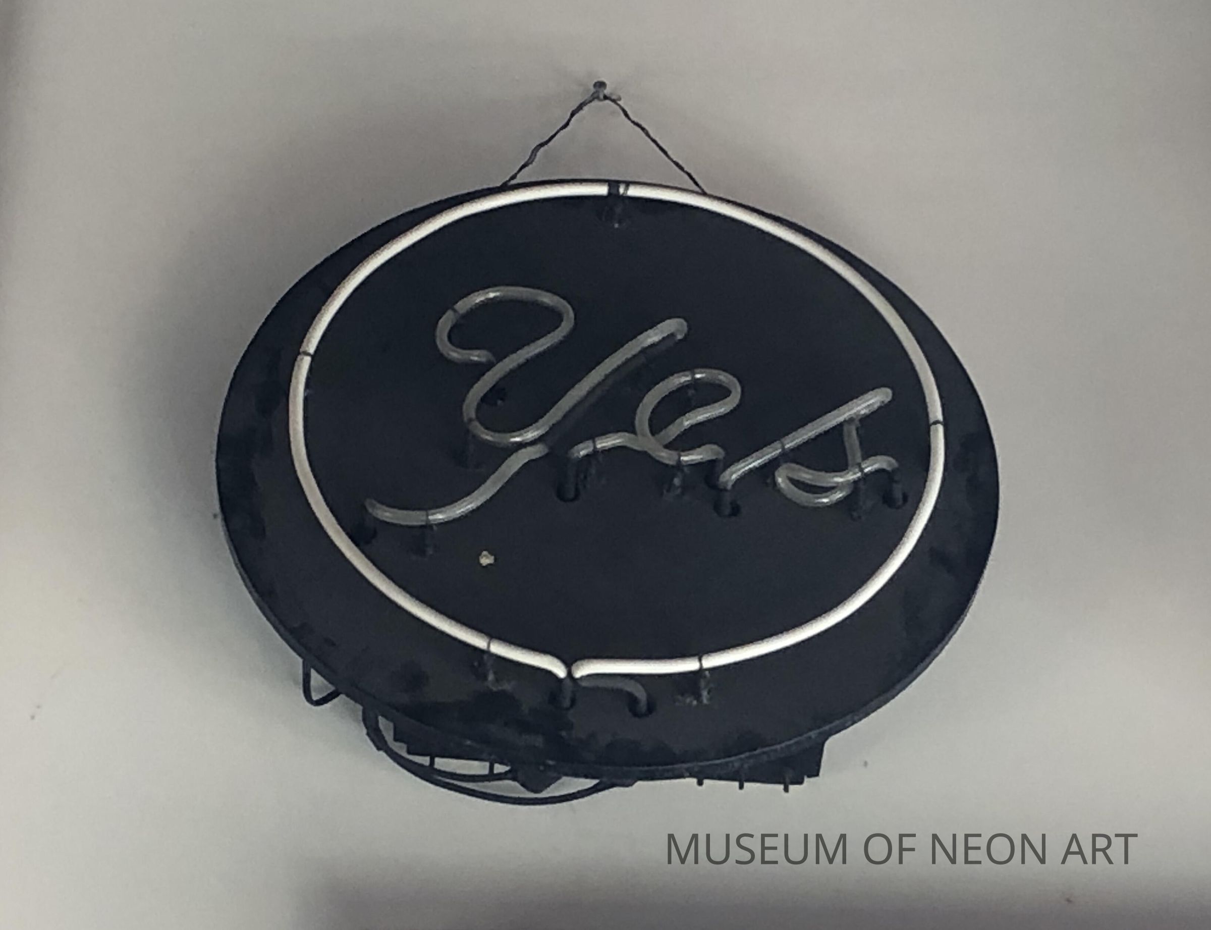 Wall sculpture mounted on plywood; animation spells out "Yes." Text: "Yes"