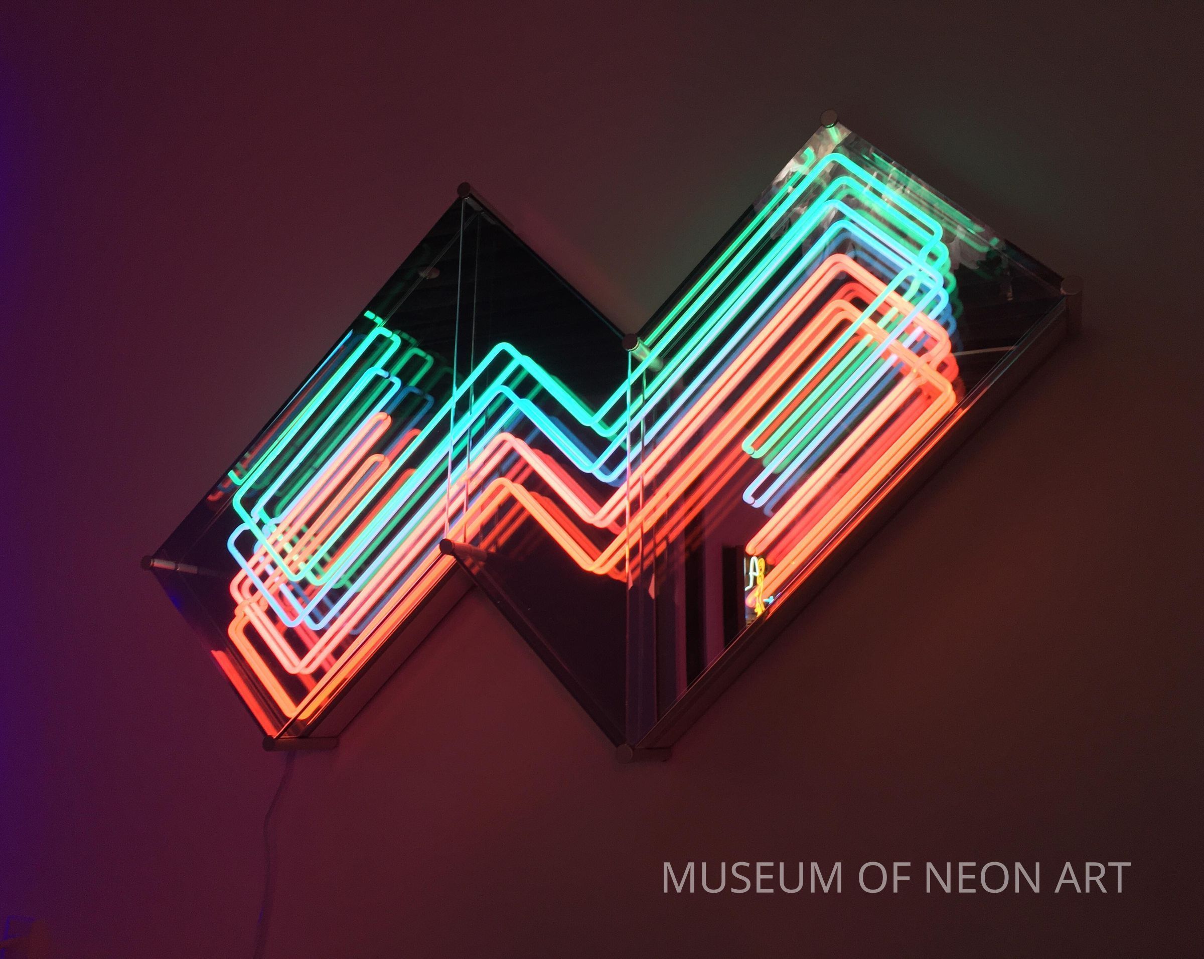 Eric Zimmerman’s neon wall sculpture is meticulously assembled, using overlapping zig-zags of neon tubing. Colored glass and phosphorus coating contribute to a pastel palette of illuminated colors. Providing a structural and illusionary space, Zimmerman's work speaks to the reflexive relationship between architecture and neon over the 20th and 21st centuries. Eric Zimmerman’s work is influenced by his father’s background as an architect. Even before attending California Institute of the Arts, Zimmerman was intrigued by the glow of neon. This eventually became the key element of his large-scale neon sculptures, which continues to inform his practice in 2D digital pieces.