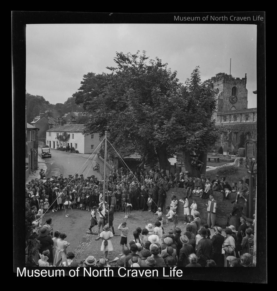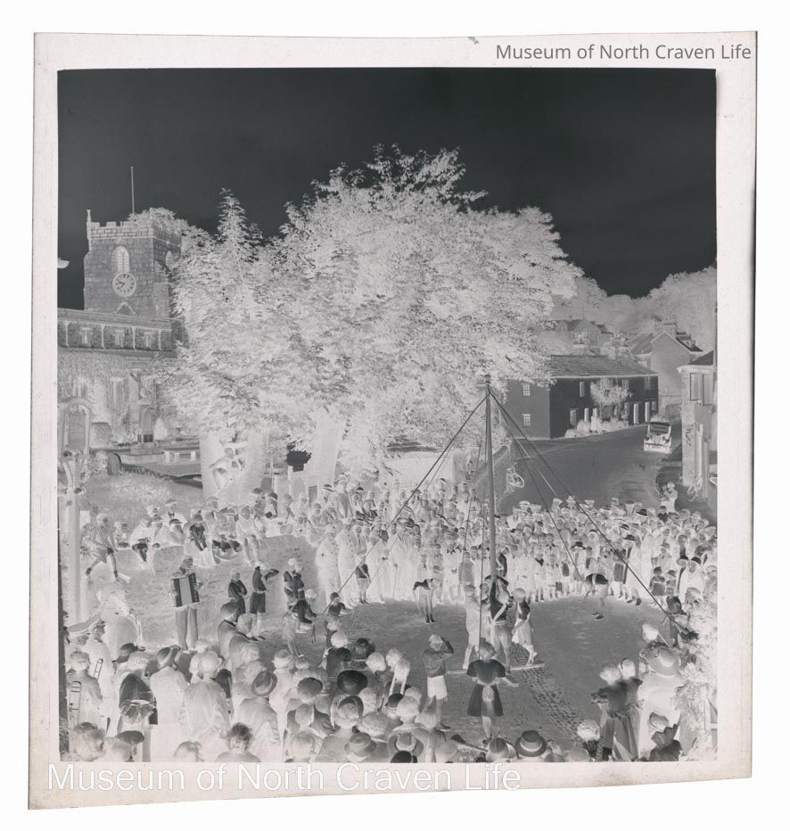 A 2 ¼" gelatin silver acetate film negative. A view of a Maypole scene in a street in Giggleswick. A large crowd of onlookers stands around. St Alkelda's appears in the backgroundCollection