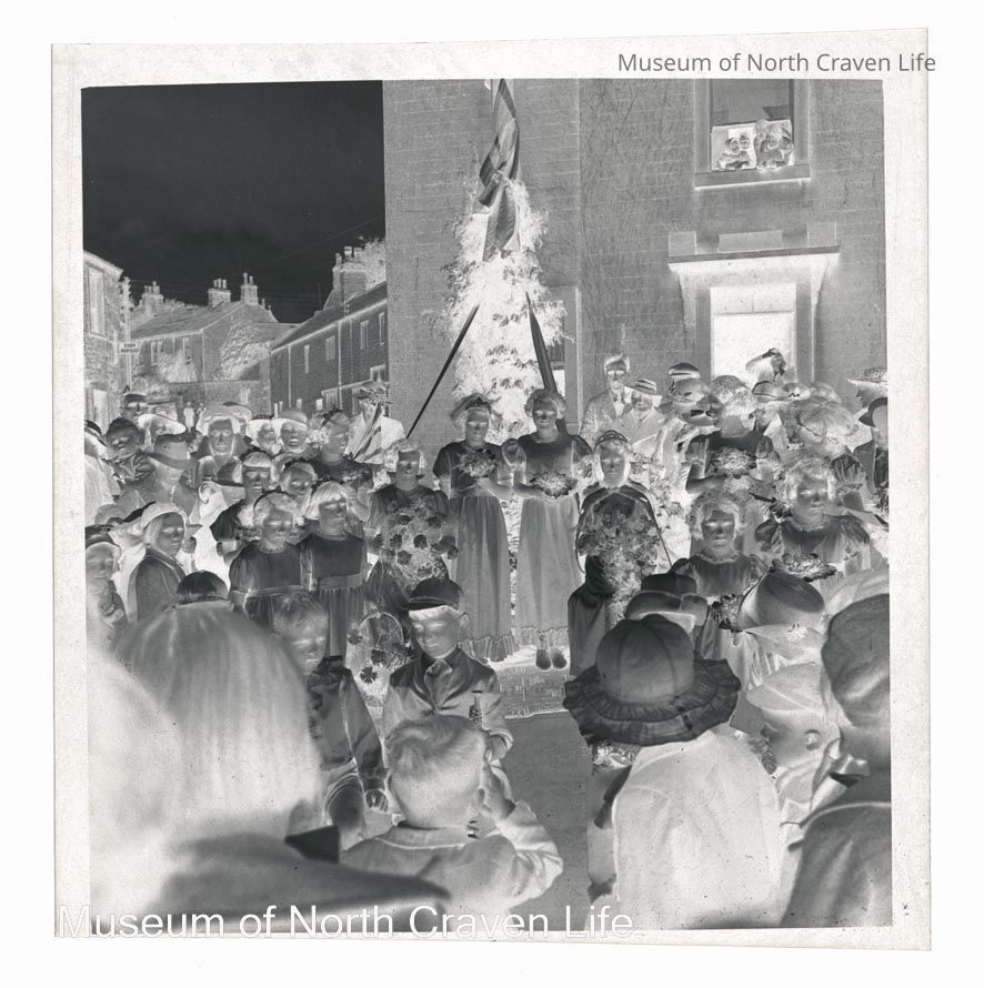 A 2 ¼" gelatin silver acetate film negative. A view of a street procession. A group of children and girls with bouquets stand in front of a decorated tree, surrounded by a crowd of onlookersCollection