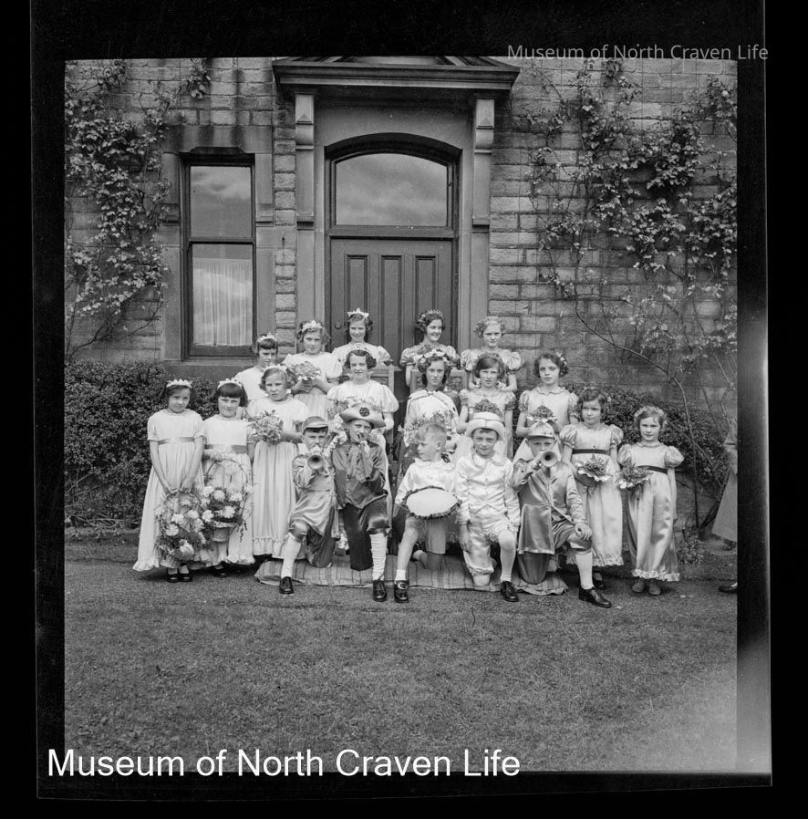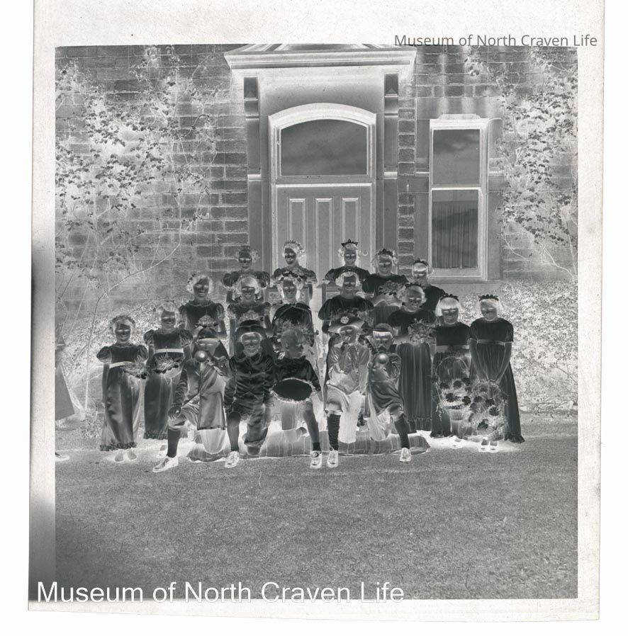 A 2 ¼" gelatin silver acetate film negative. A group portrait of children in fancy dress ; they stand and sit in front of a door. Giggleswick Festival 1938Collection