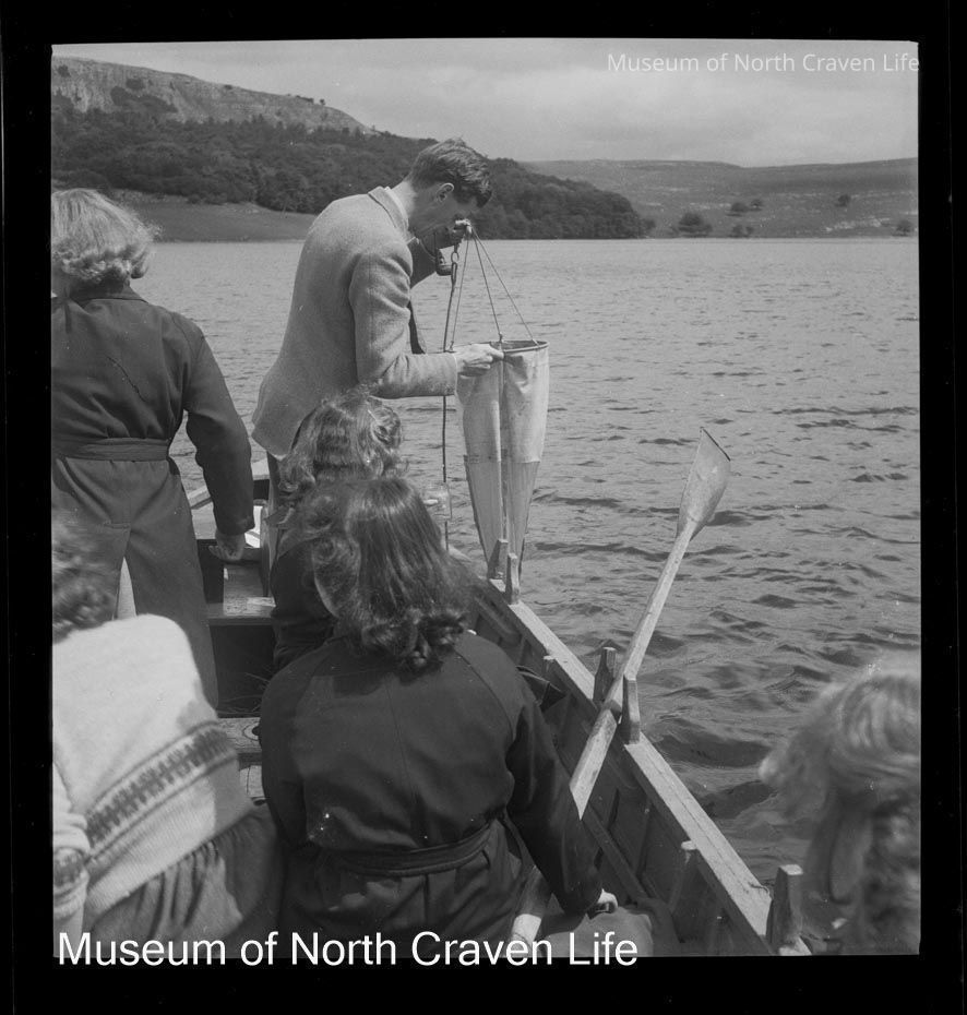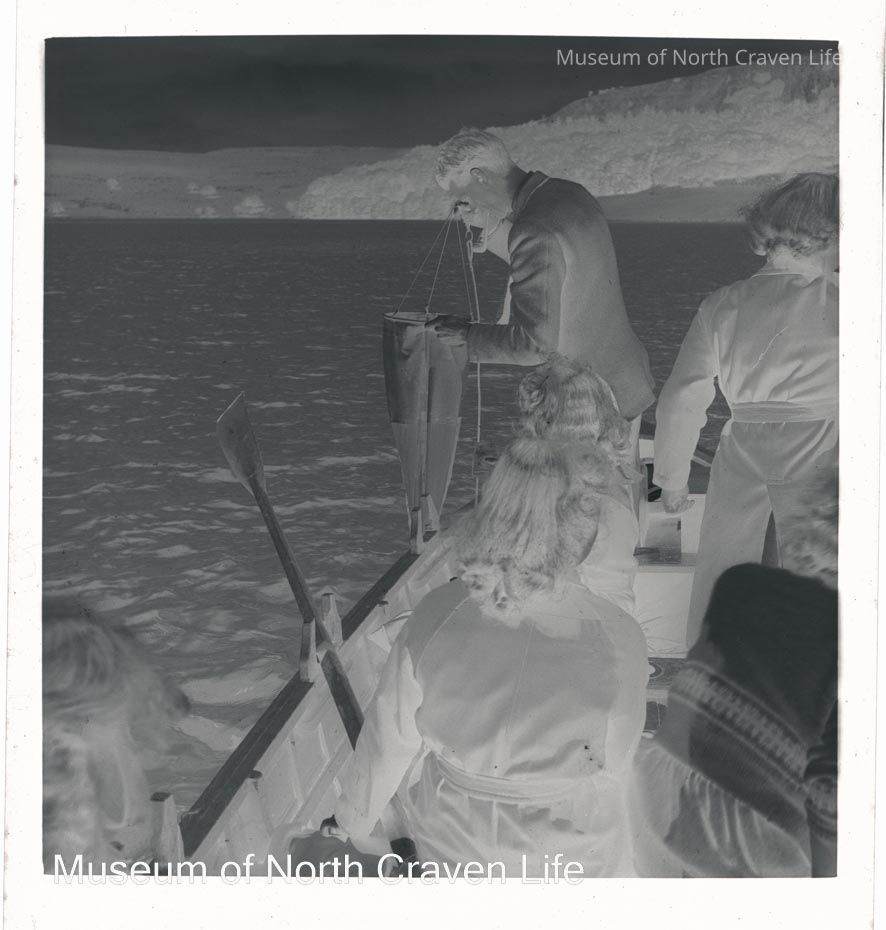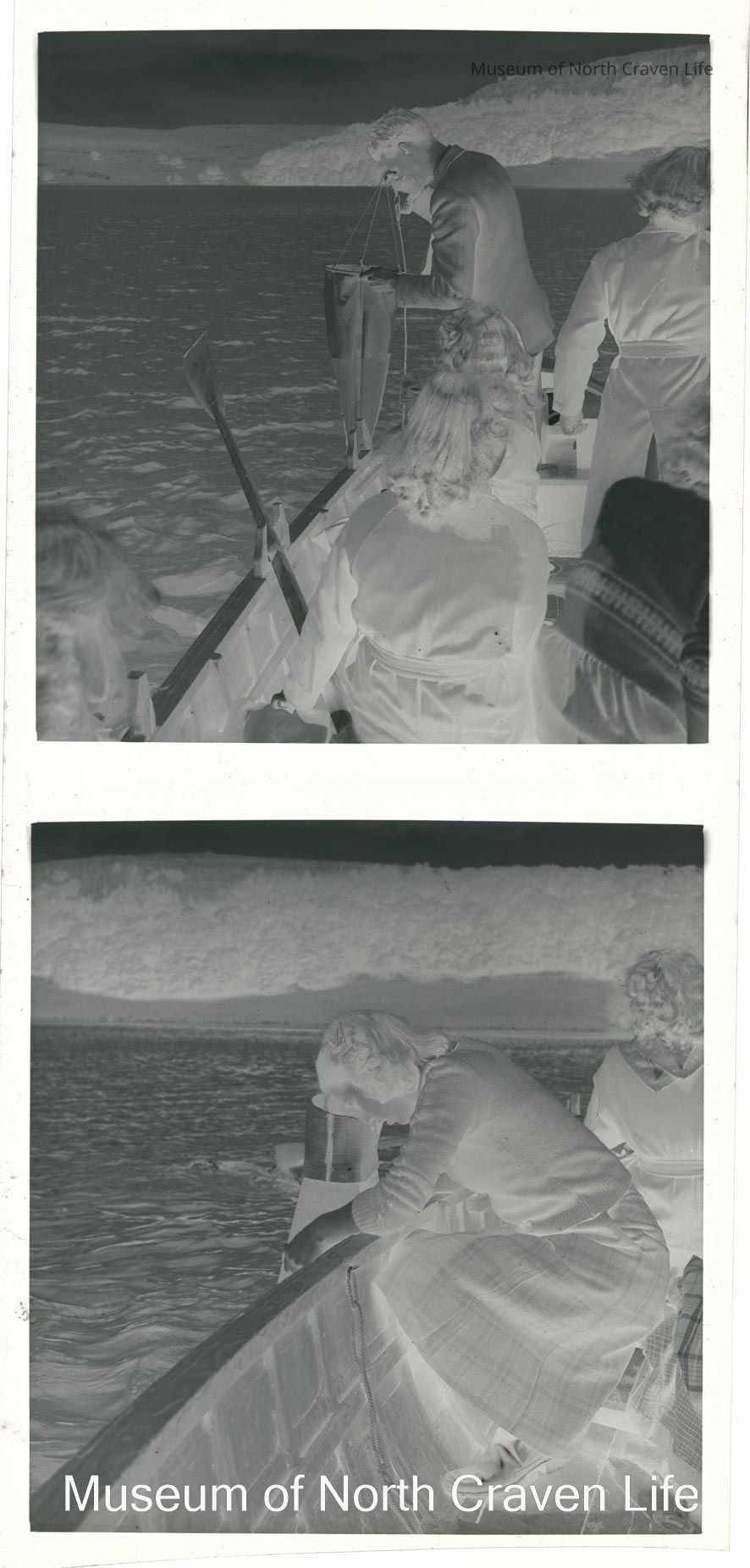 A 2 ¼" gelatin silver acetate film negative. A view of a man in a boat taking a sample from the lakeCollection