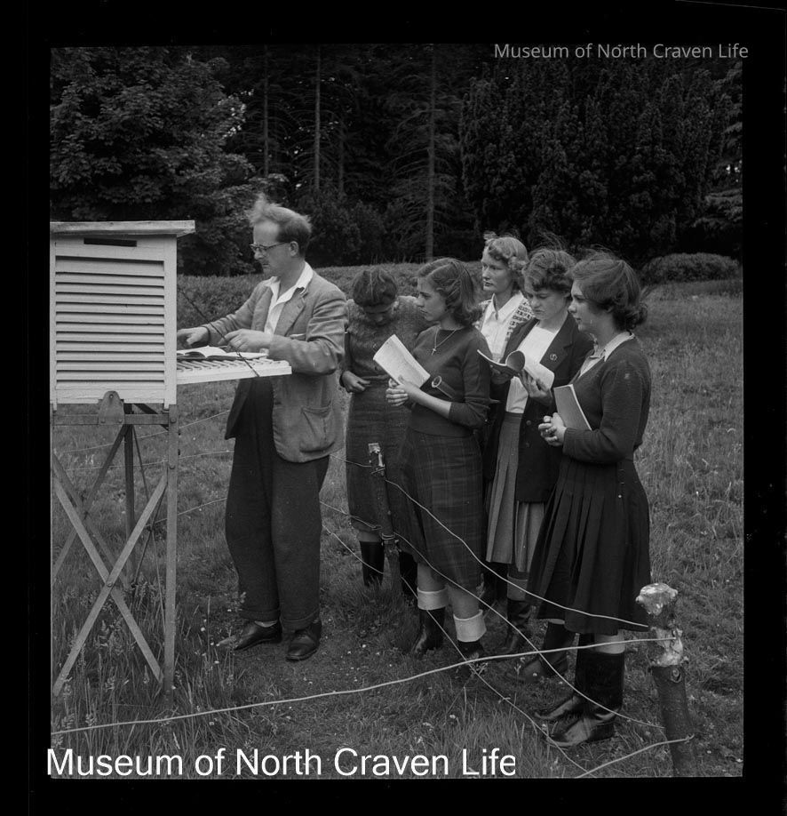 A 2 ¼" gelatin silver acetate film negative. Weather Field Studies : a view of a tutor with a group of five studentsCollection