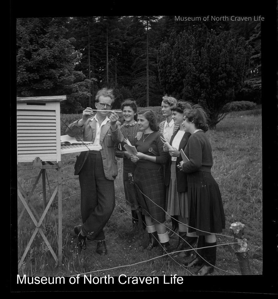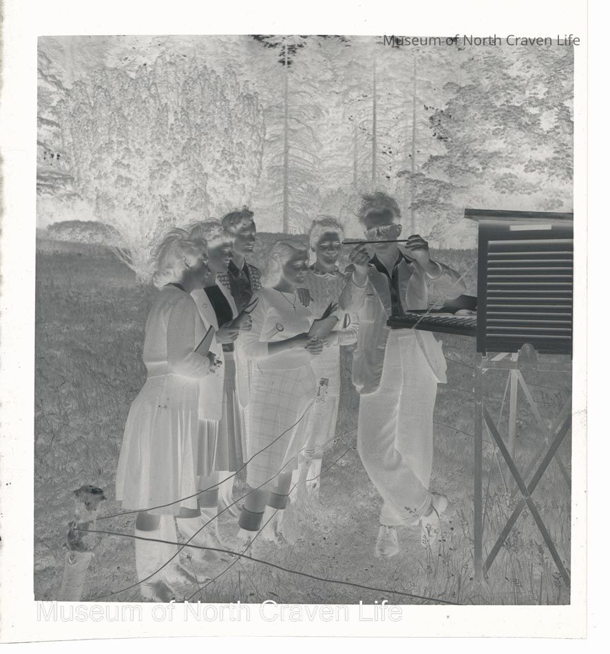 A 2 ¼" gelatin silver acetate film negative. Weather Field Studies : a view of a tutor with a group of five studentsCollection