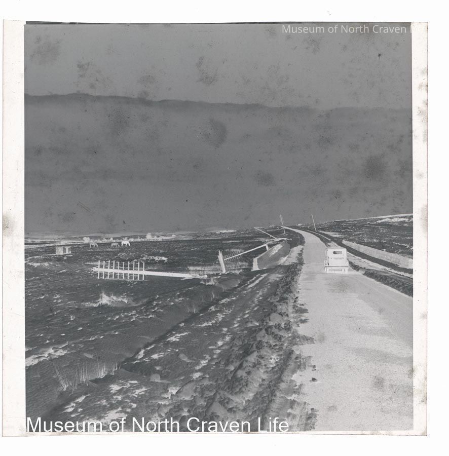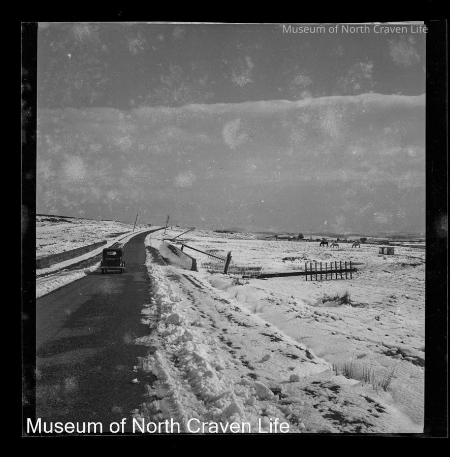A 2 ¼" gelatin silver acetate film negative. A view of Newby Moor in the snow. A car drives down a road flanked with snow drifts ; a number of telegraph poles lie on the ground to the right of the road ; 3 horses graze in the distanceCollection