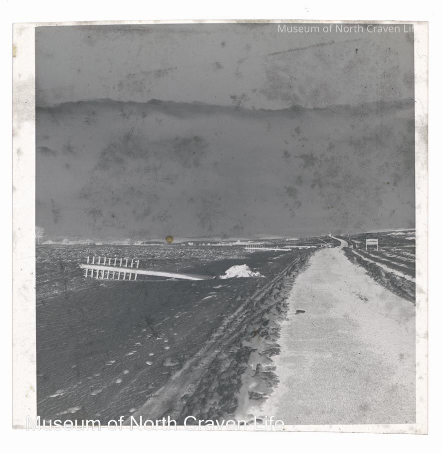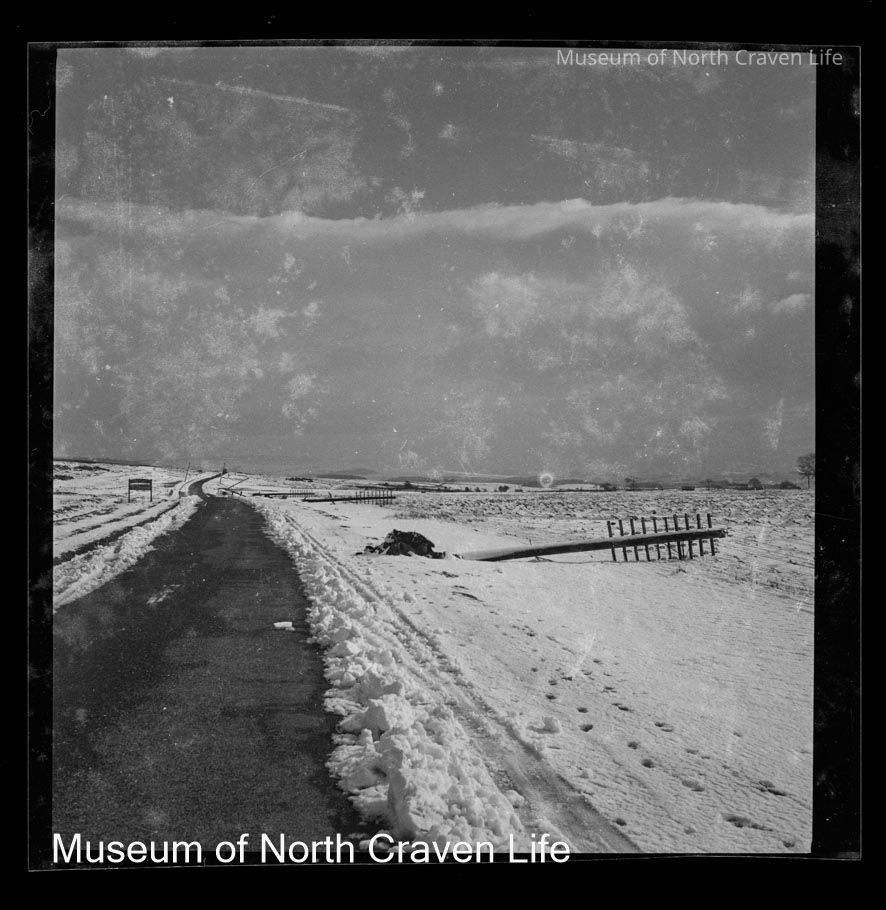 A 2 ¼" gelatin silver acetate film negative. A view of Newby Moor in the snow. A road flanked with snow drifts is on the left ; a number of telegraph poles lie on the ground to the right of the roadCollection