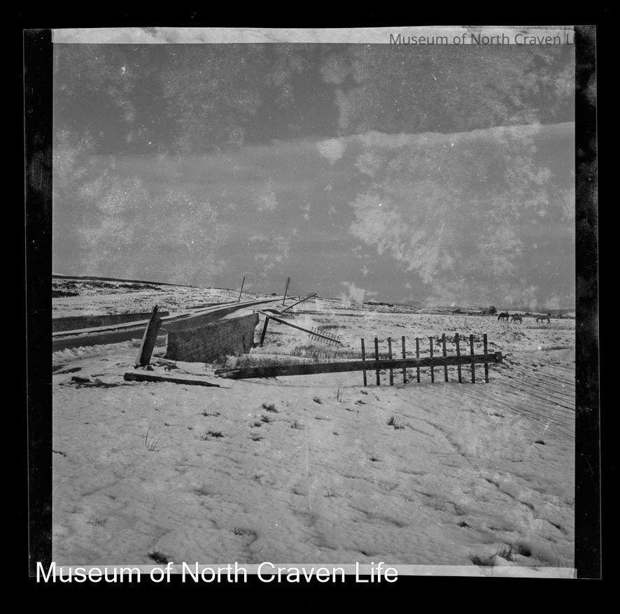 A 2 ¼" gelatin silver acetate film negative. A view of Newby Moor in the snow. A road flanked with snow drifts is on the left ; a number of telegraph poles lie on the ground to the right of the roadCollection