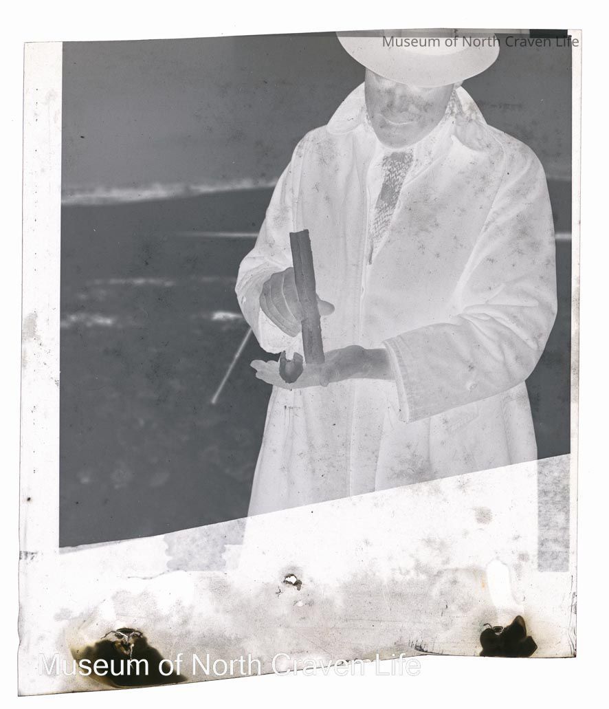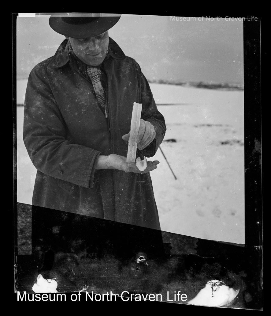 A 2 ¼" gelatin silver acetate film negative. A view of Newby Moor in the snow. A man stands in the foreground holding icicles with a camera on tripod behind himCollection