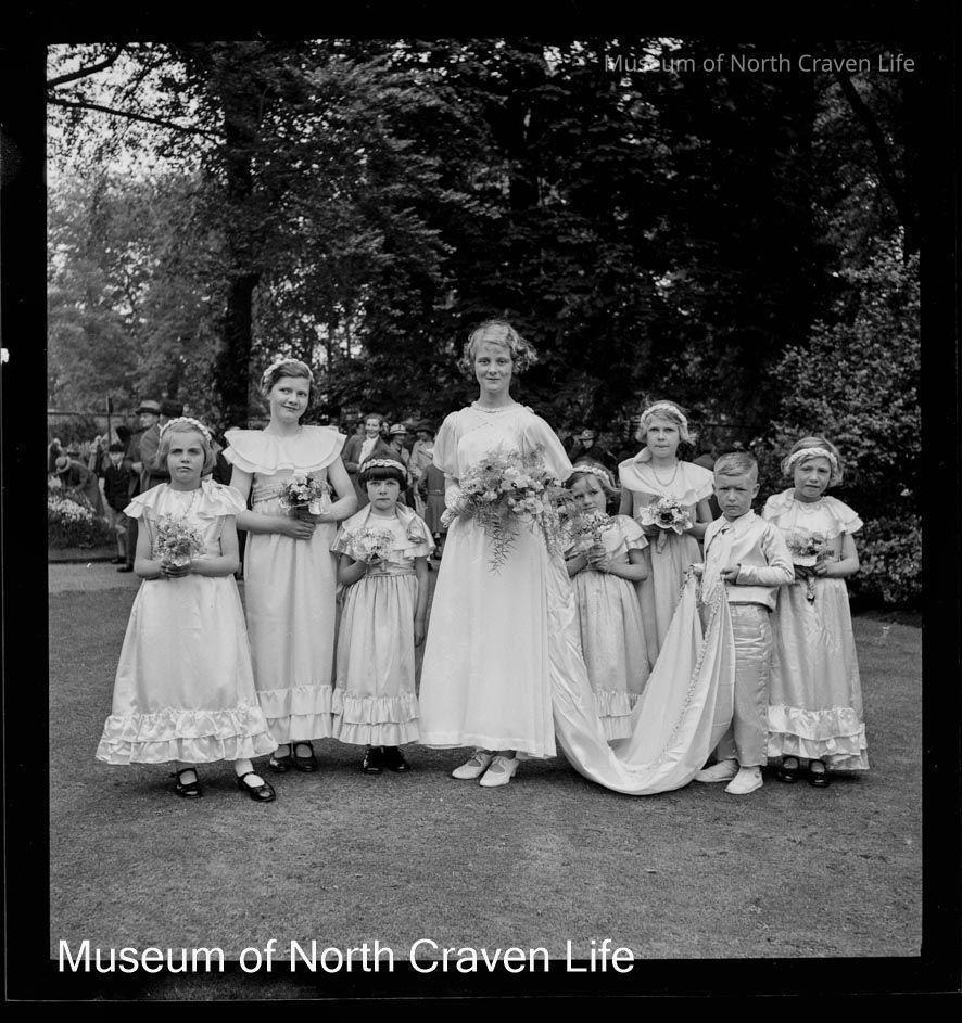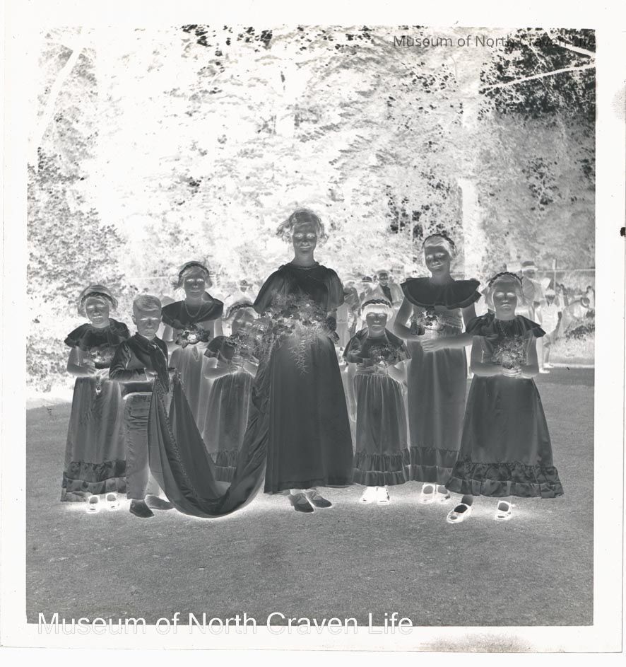 A 2 ¼" gelatin silver acetate film negative. A group portrait of children in fancy dress on a lawn in front of some bushes; a young woman is wearing a train followed by a page and other escortsCollection