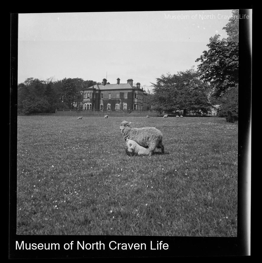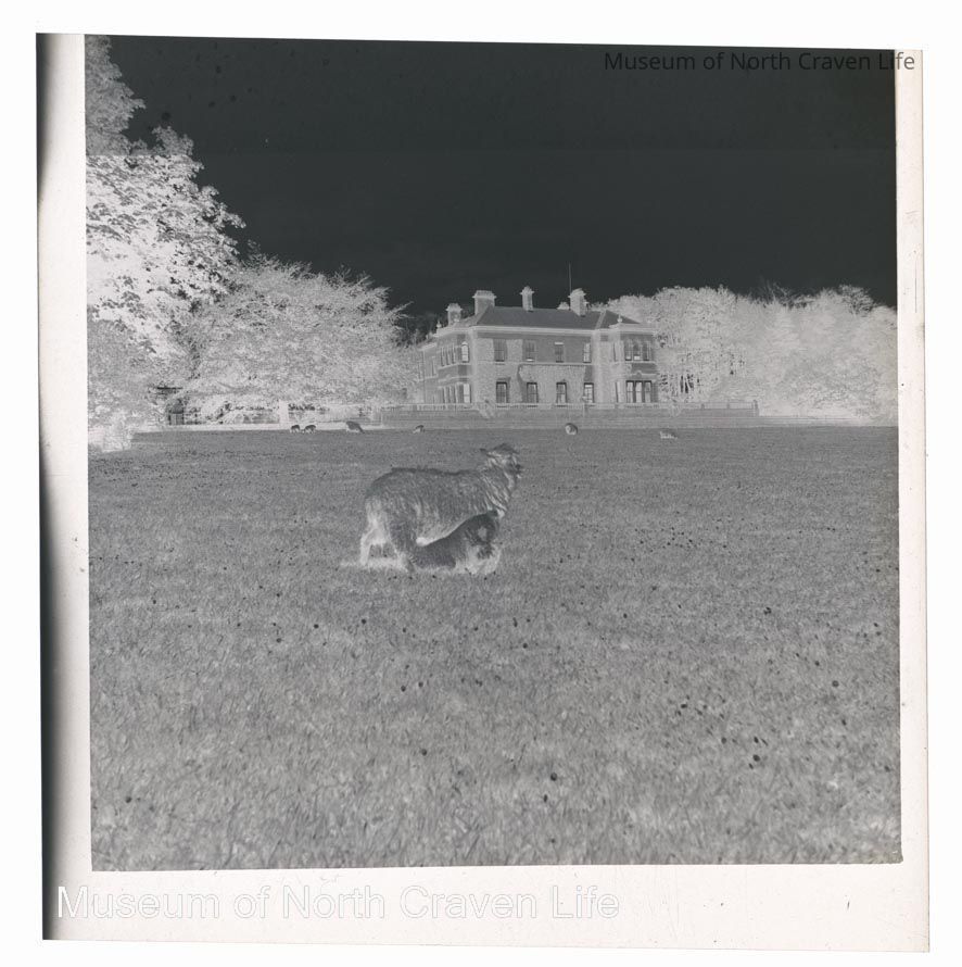 A 2 ¼" gelatin silver acetate film negative. A view of Newfield Hall, Calton (Malhamdale), across fields with sheep in the foregroundCollection