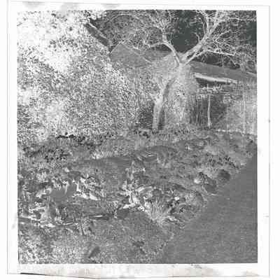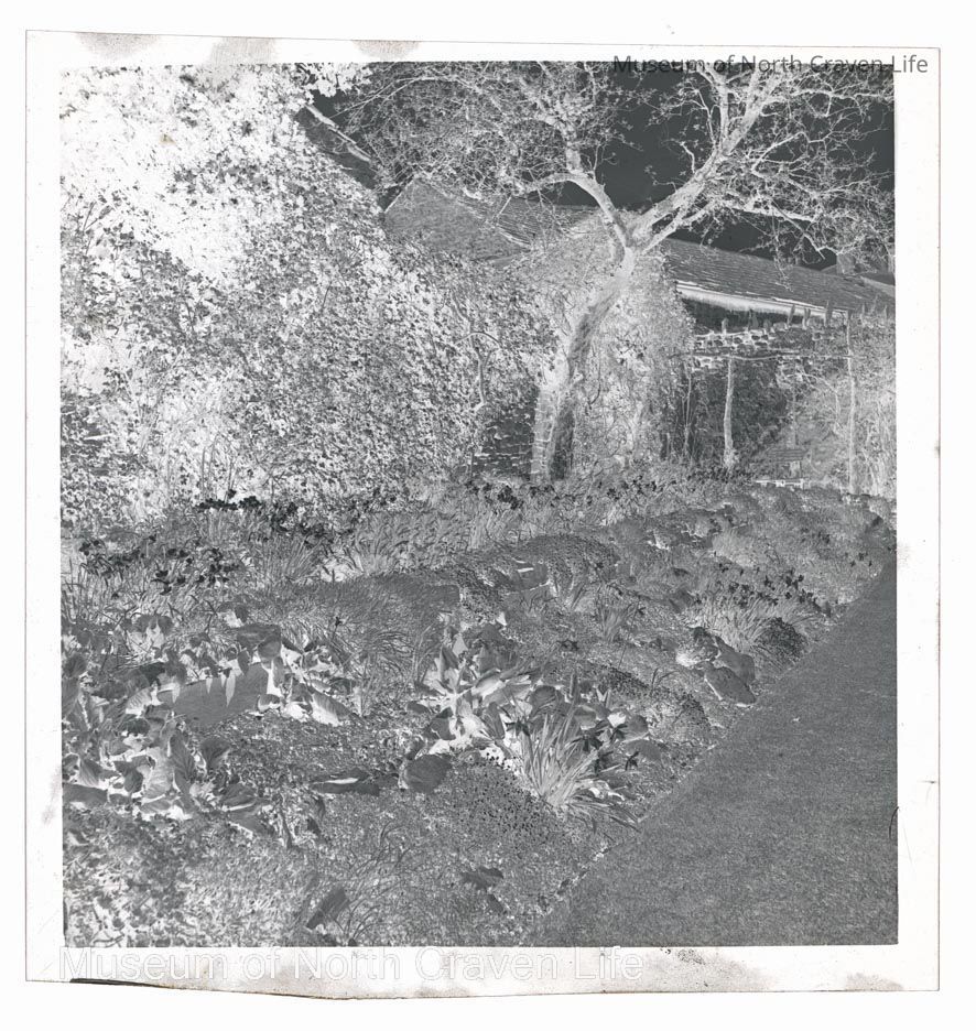 A 2 ¼" gelatin silver acetate film negative. A view of Rose Cottage and gardens in Giggleswick. A flowerbed bordered by a stone wall with a seat in the background underneath a treeCollection