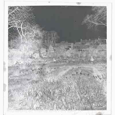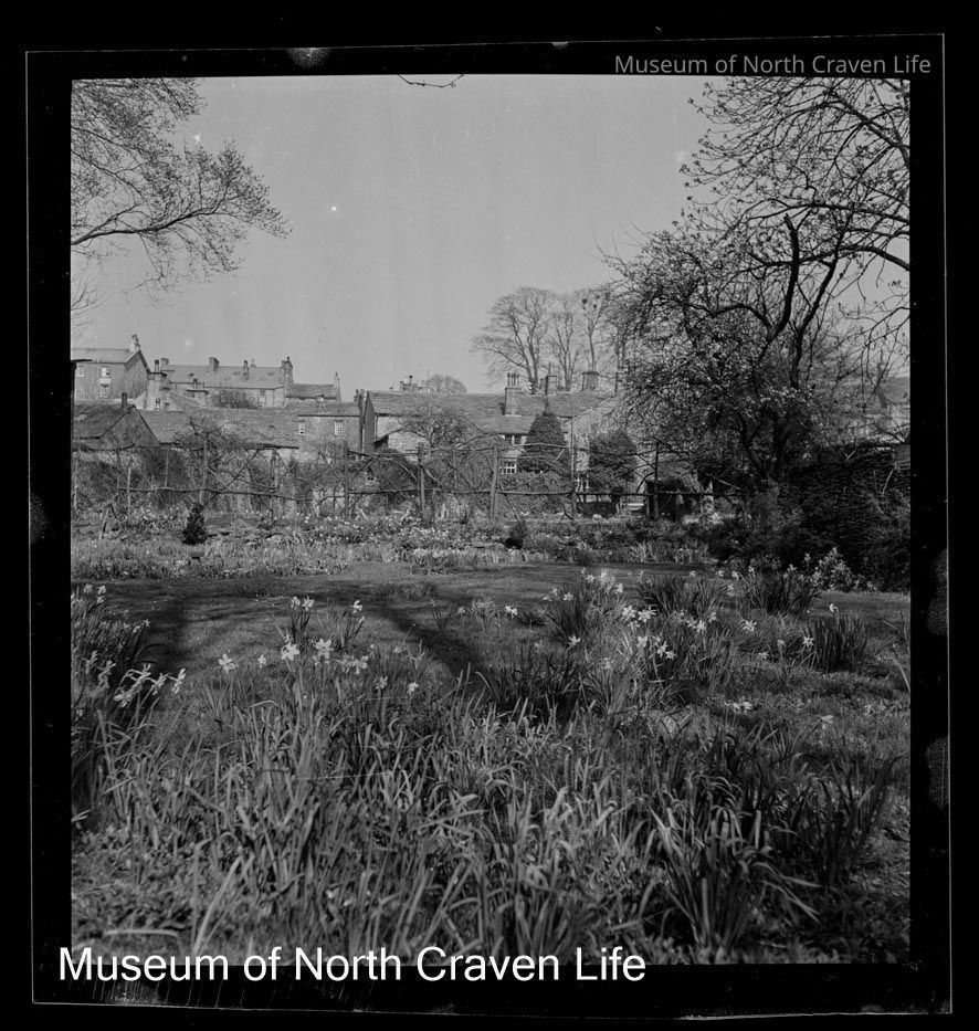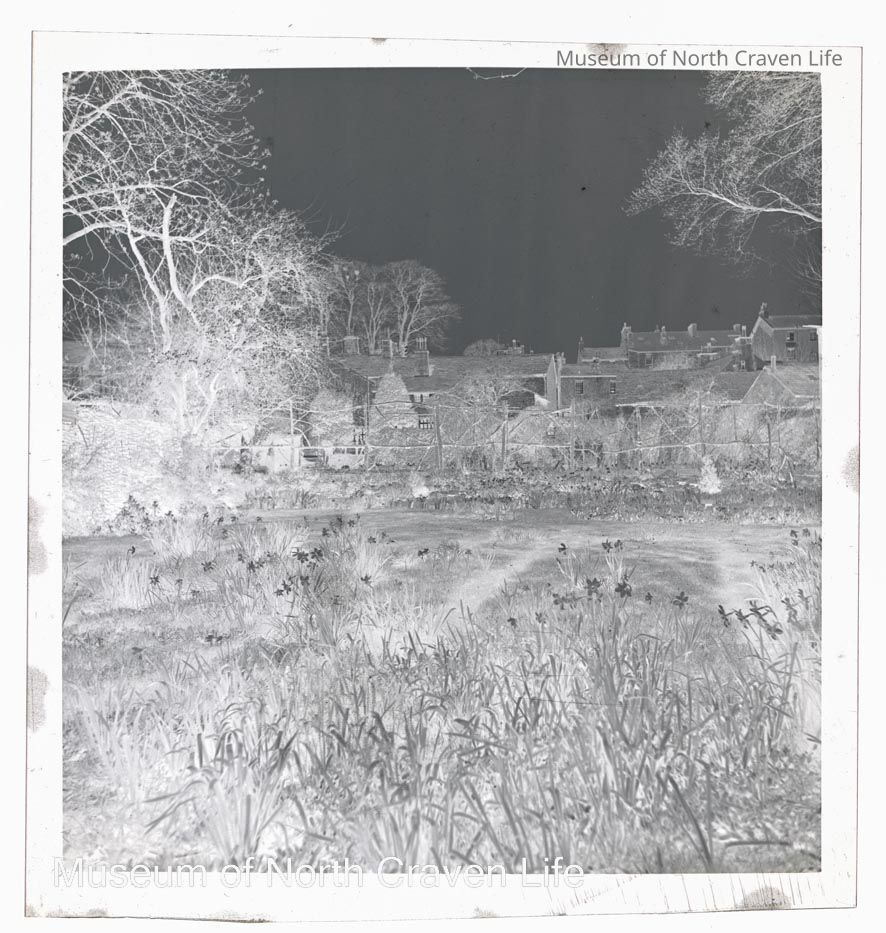 A 2 ¼" gelatin silver acetate film negative. A view of Rose Cottage and gardens in Giggleswick. Daffodils dot an expanse of grass which is bordered by a wooden fence. In the distance appear the houses of GiggleswickCollection