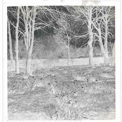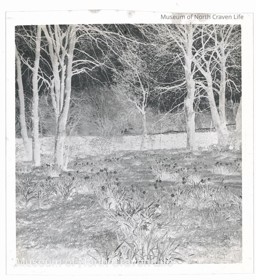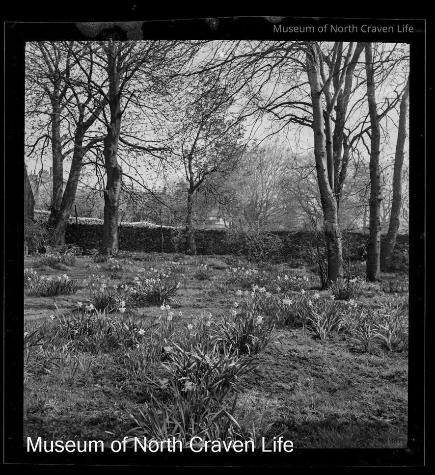 A 2 ¼" gelatin silver acetate film negative. A view of Rose Cottage and gardens in Giggleswick. Trees and daffodils dot an expanse of grass which is bordered by a stone wallCollection
