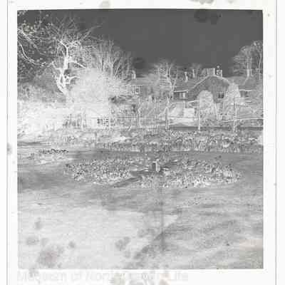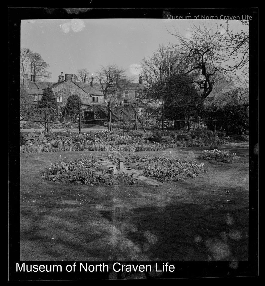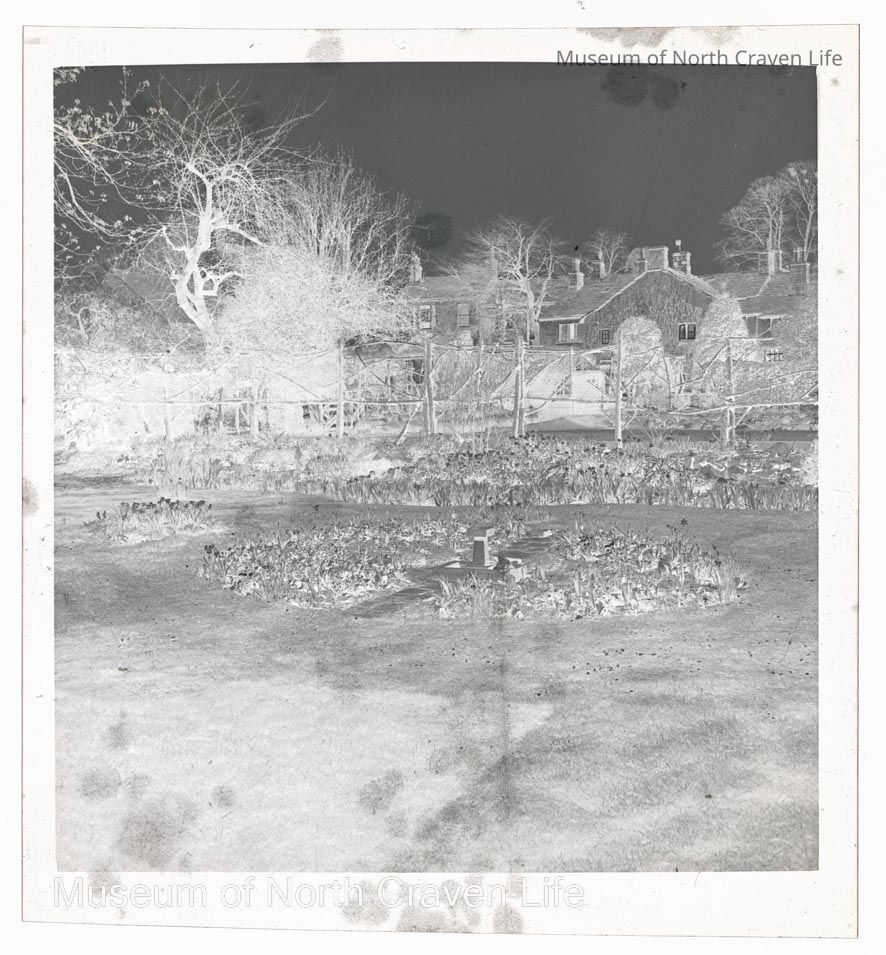 A 2 ¼" gelatin silver acetate film negative. A view of Rose Cottage and gardens in Giggleswick. A view across a lawn with a central circular flowerbed in which stands a stone bird bath and pedestal. A wooden fence appears behind the flowerbed with the houses of Giggleswick in the distanceCollection
