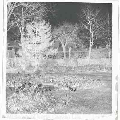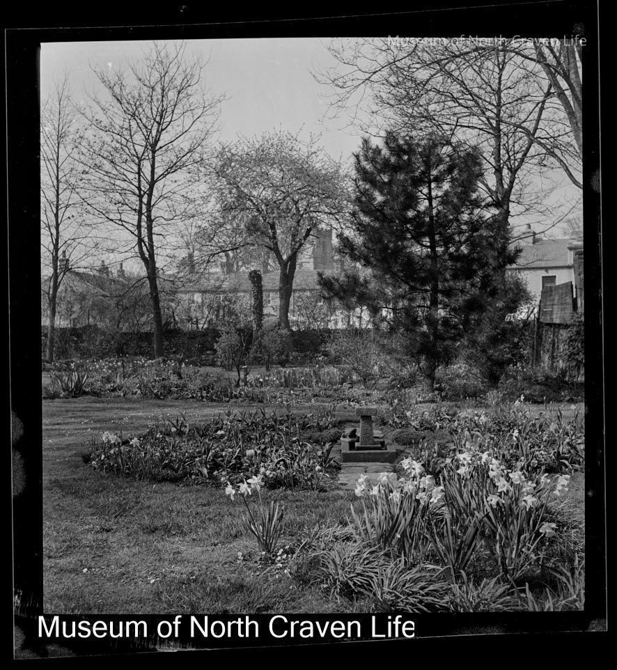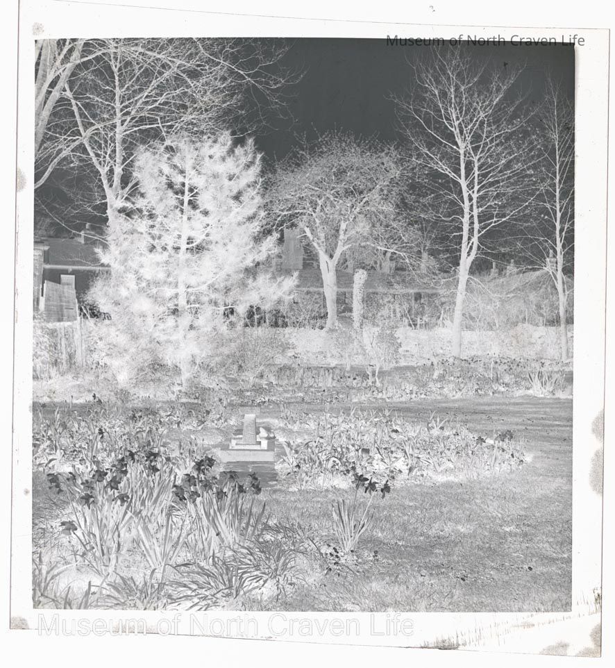 A 2 ¼" gelatin silver acetate film negative. A view of Rose Cottage and gardens in Giggleswick. A view across a lawn with a central circular flowerbed in which stands a stone bird bath and pedestal. A stone wall appears behind the flowerbed with the houses of Giggleswick in the distanceCollection
