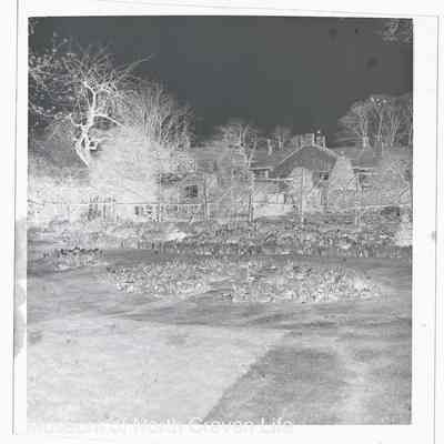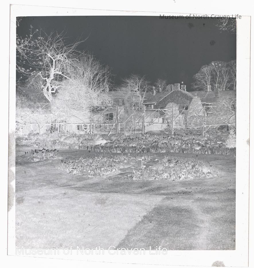 A 2 ¼" gelatin silver acetate film negative. A view of Rose Cottage and gardens in Giggleswick. A view across a lawn with a central circular flowerbed in which stands a stone bird bath and pedestal. A wooden fence appears behind the flowerbed with the houses of Giggleswick in the distanceCollection