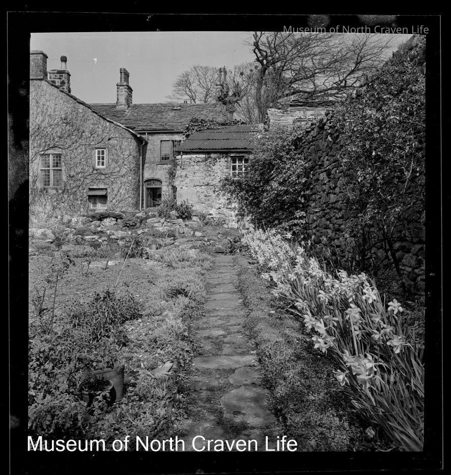 A 2 ¼" gelatin silver acetate film negative. A view of Rose Cottage and gardens in Giggleswick. A flagged path descends to the right, bordered by daffodilsCollection