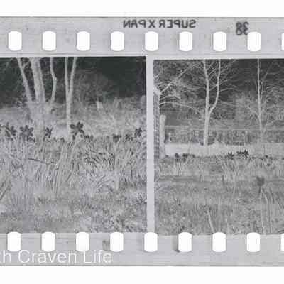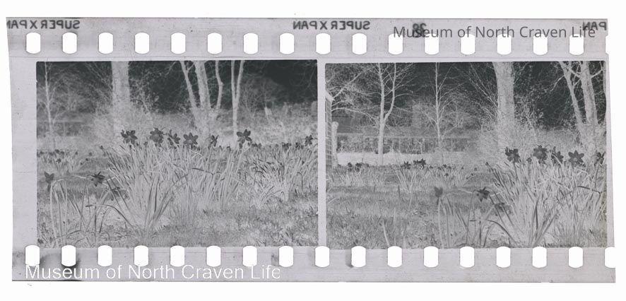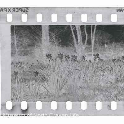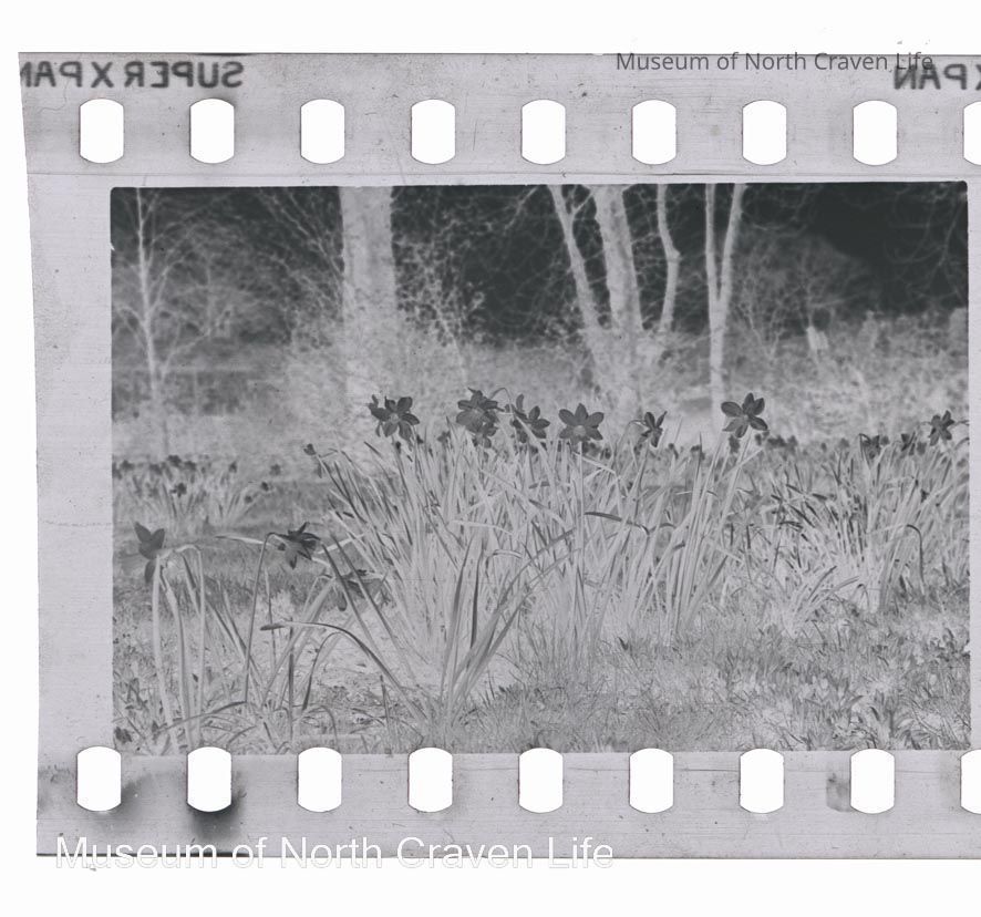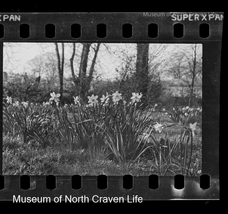 A 35mm gelatin silver film negative. A view of Rose Cottage and gardens in Giggleswick. A close up of daffodils in grass with trees and houses in the distanceCollection