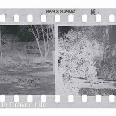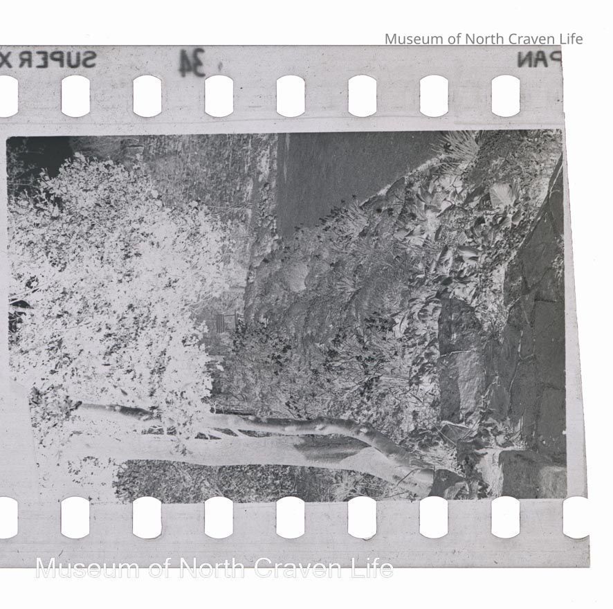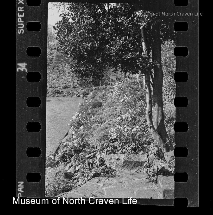 A 35mm gelatin silver film negative. A view of Rose Cottage and gardens in Giggleswick. A view of a flowerbed with a tree in the foreground, a lawn to the left and a stone wall in the distanceCollection
