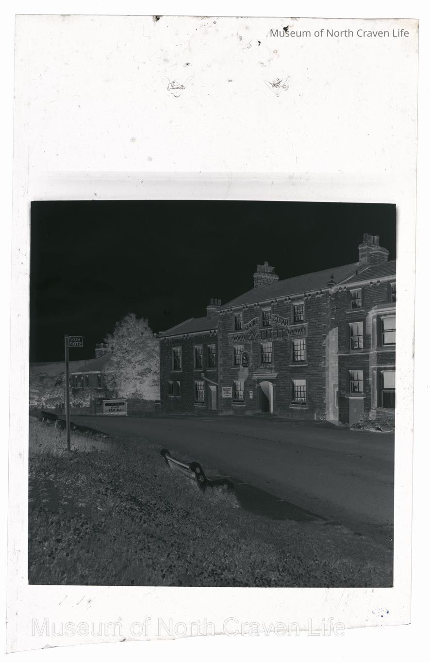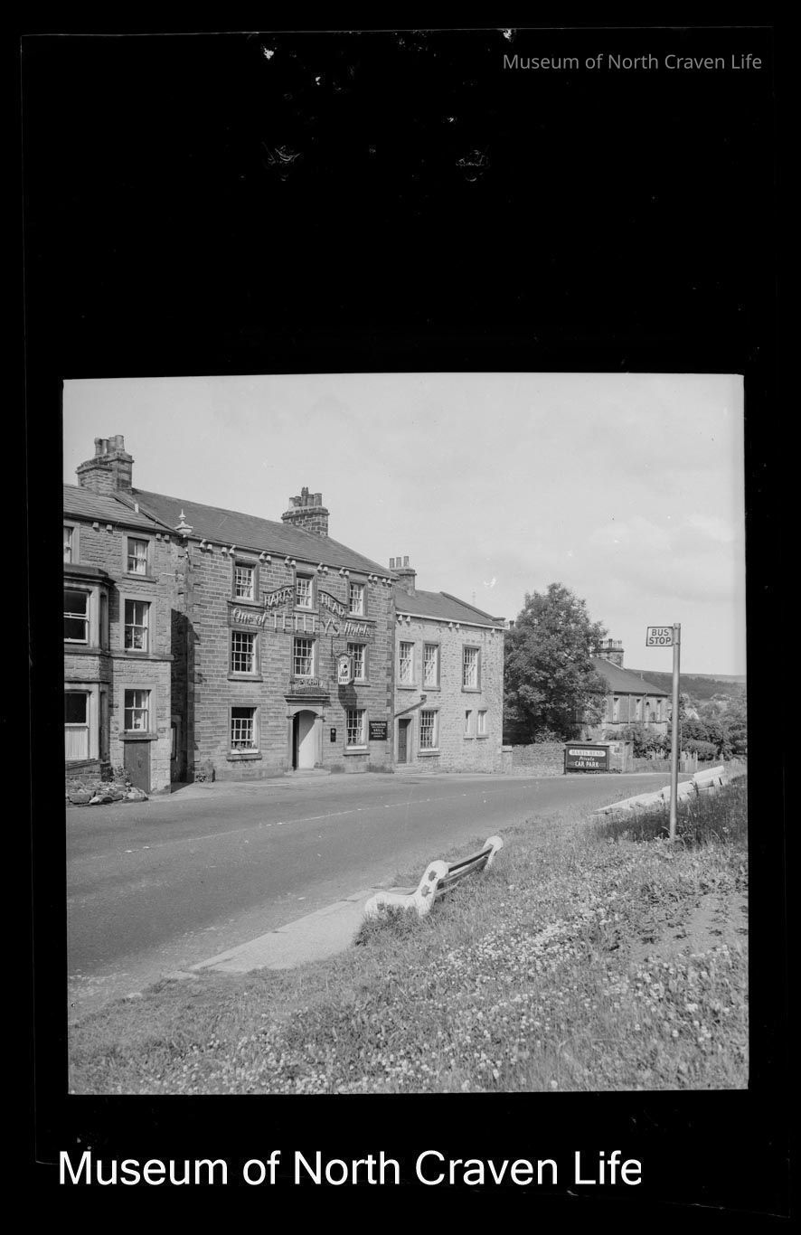 A 2 ¼" gelatin silver acetate film negative. A view of the exterior of the Harts Head Hotel in Giggleswick Sign above the door: "HARTS HEAD ONE OF TETLEY'S HOTELS". A listed building, it dates from C19 with C20 alterations (https://historicengland.org.uk/listing/the-list/list-entry/1317035?section=official-list-entry)Collection