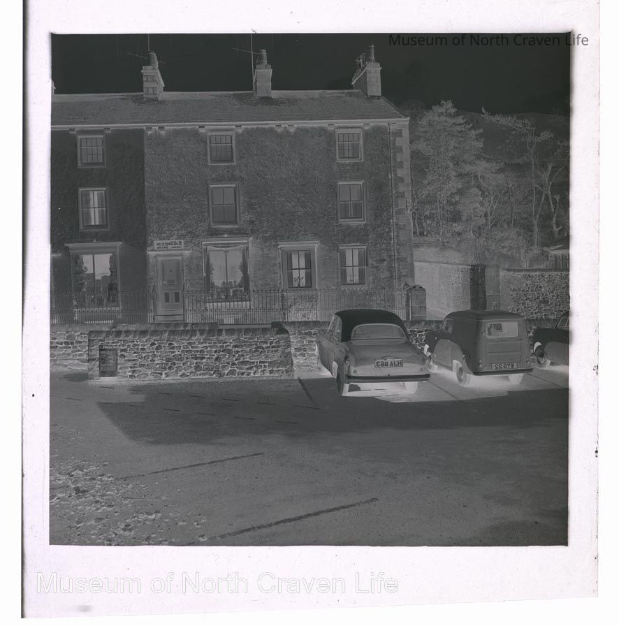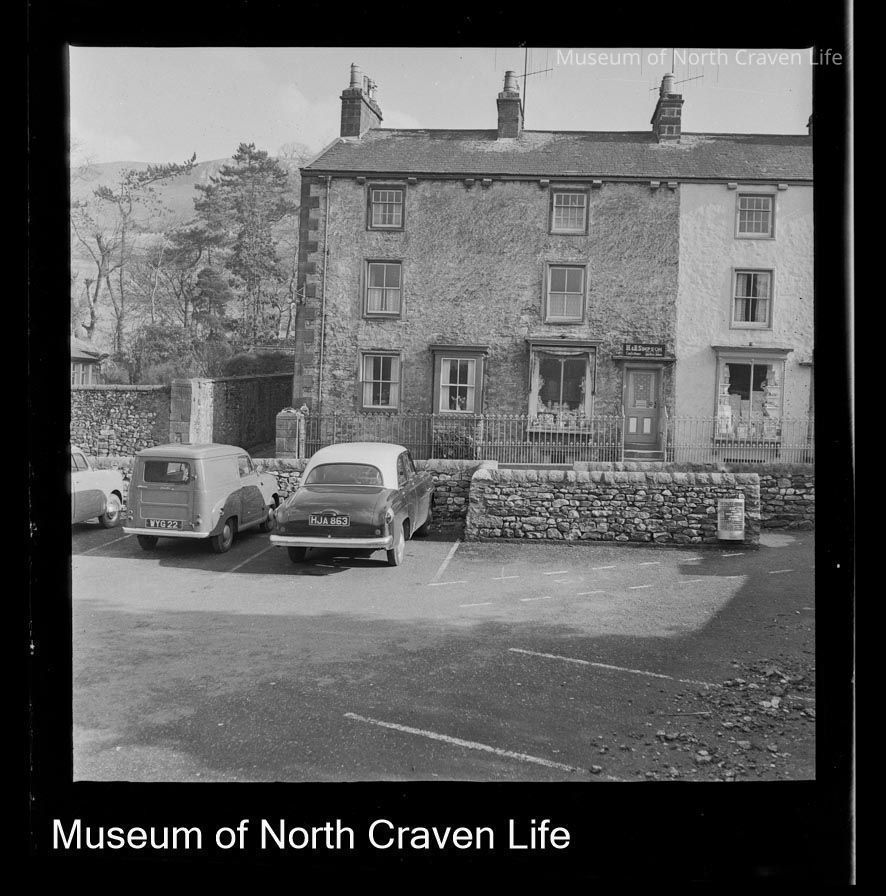 A 2 ¼" gelatin silver acetate film negative. A view from a carpark of a commercial establishment with sign in Church Street, Settle : H. & E. Simpson (Confectioner)Collection