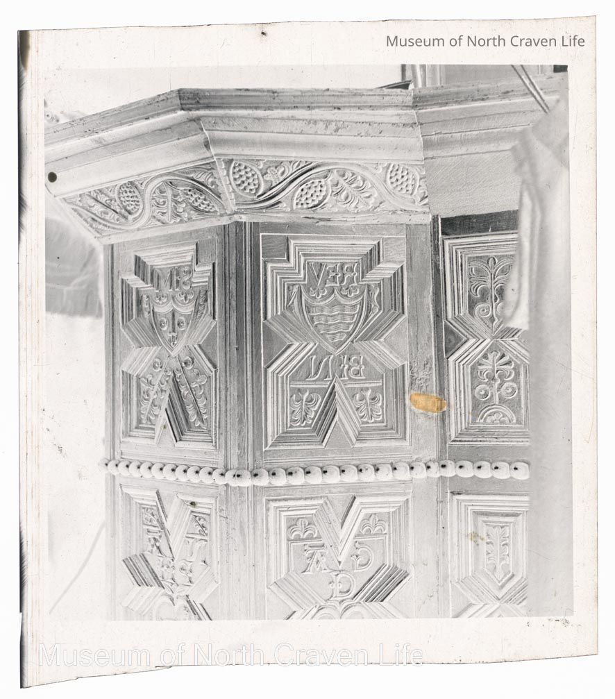 A 2 ¼" gelatin silver acetate film negative. A view of panels of the three decker 17C pulpit in the church of St Alkelda in Giggleswick (https://historicengland.org.uk/listing/the-list/list-entry/1157303?section=official-list-entry)Collection