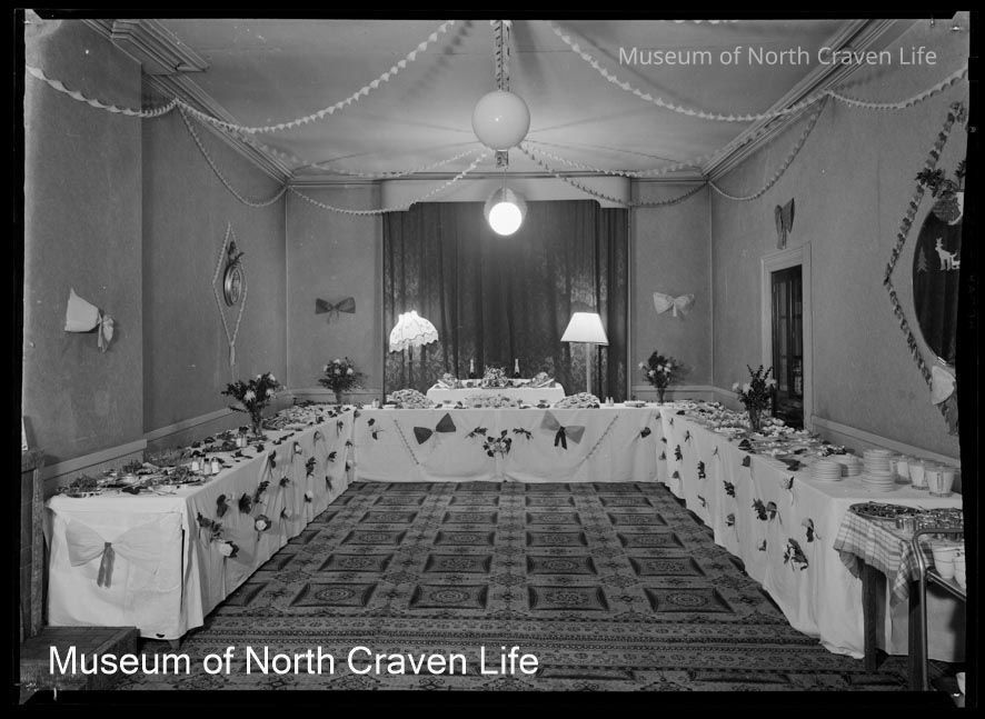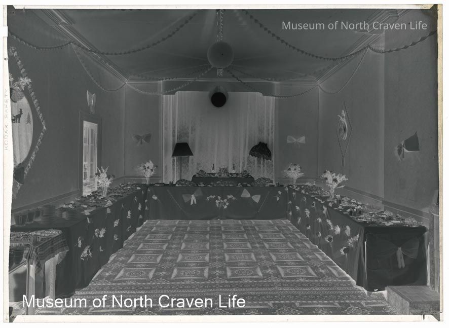 A gelatin silver acetate film negative. A view of the interior of the Ashfield Hotel (now Settle Social Club in Duke Street). A reception room with tables set for a ?wedding mealCollection