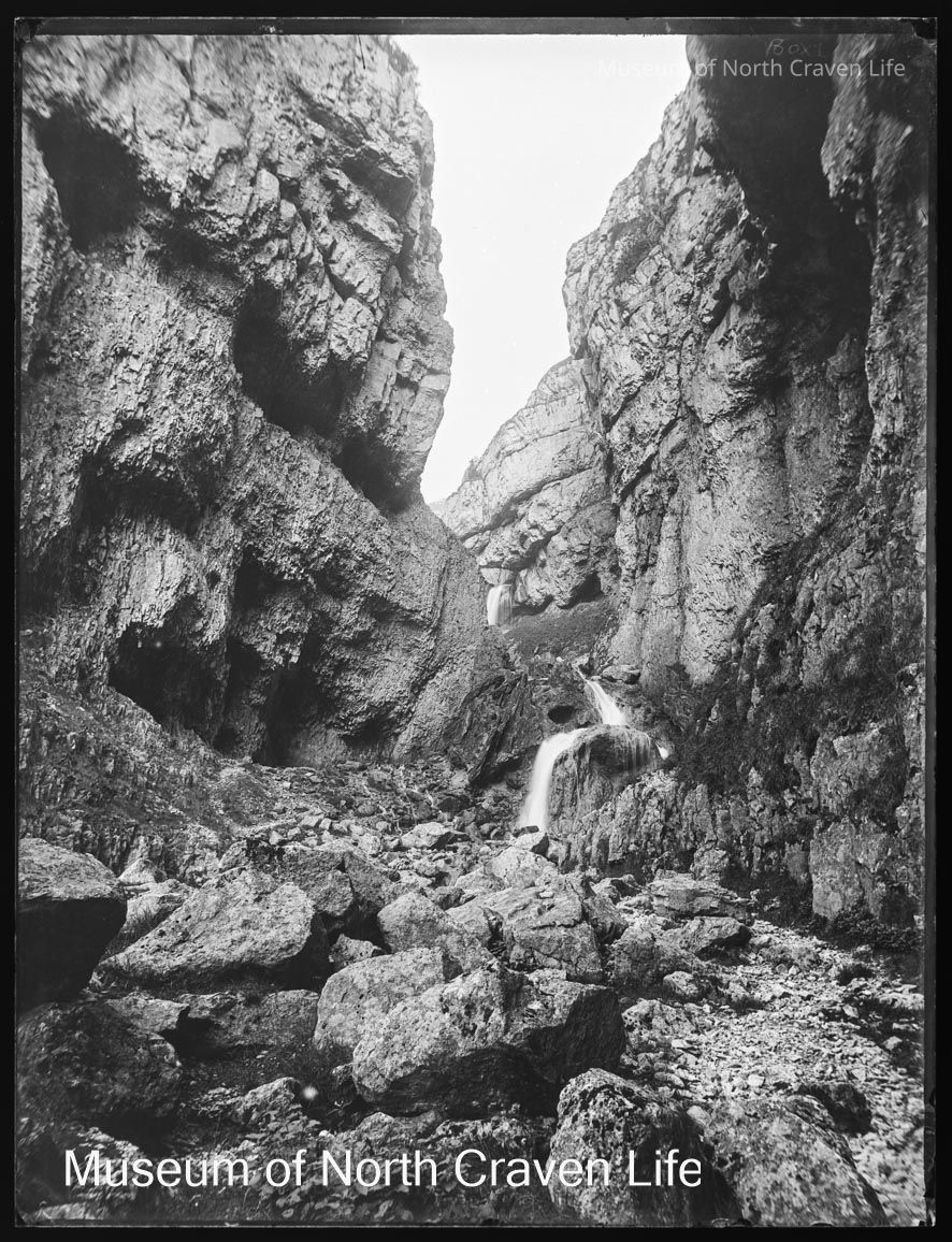 A full-plate gelatin silver glass negative. View of Gordale Scar from bottom, with limestone cliffs and waterfallsCollection
