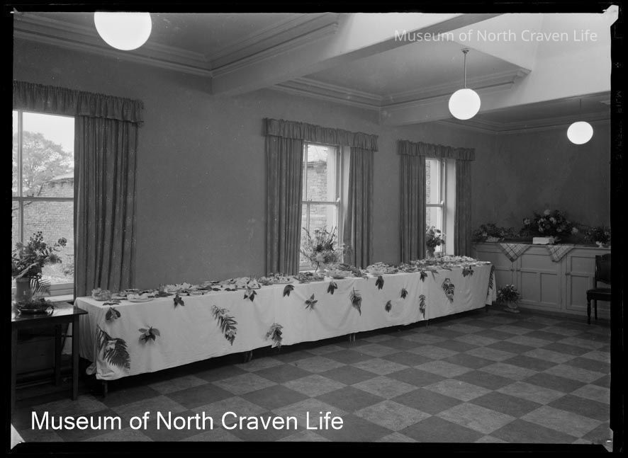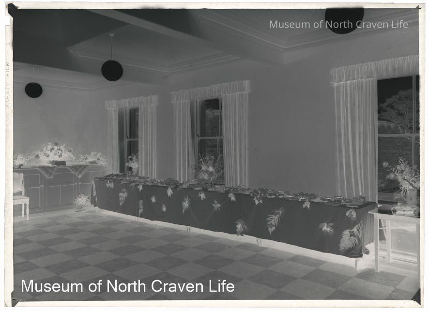 A gelatin silver acetate film negative. A view of the interior of the Ashfield Hotel (now Settle Social Club in Duke Street). A reception room with tables set for a buffet mealCollection