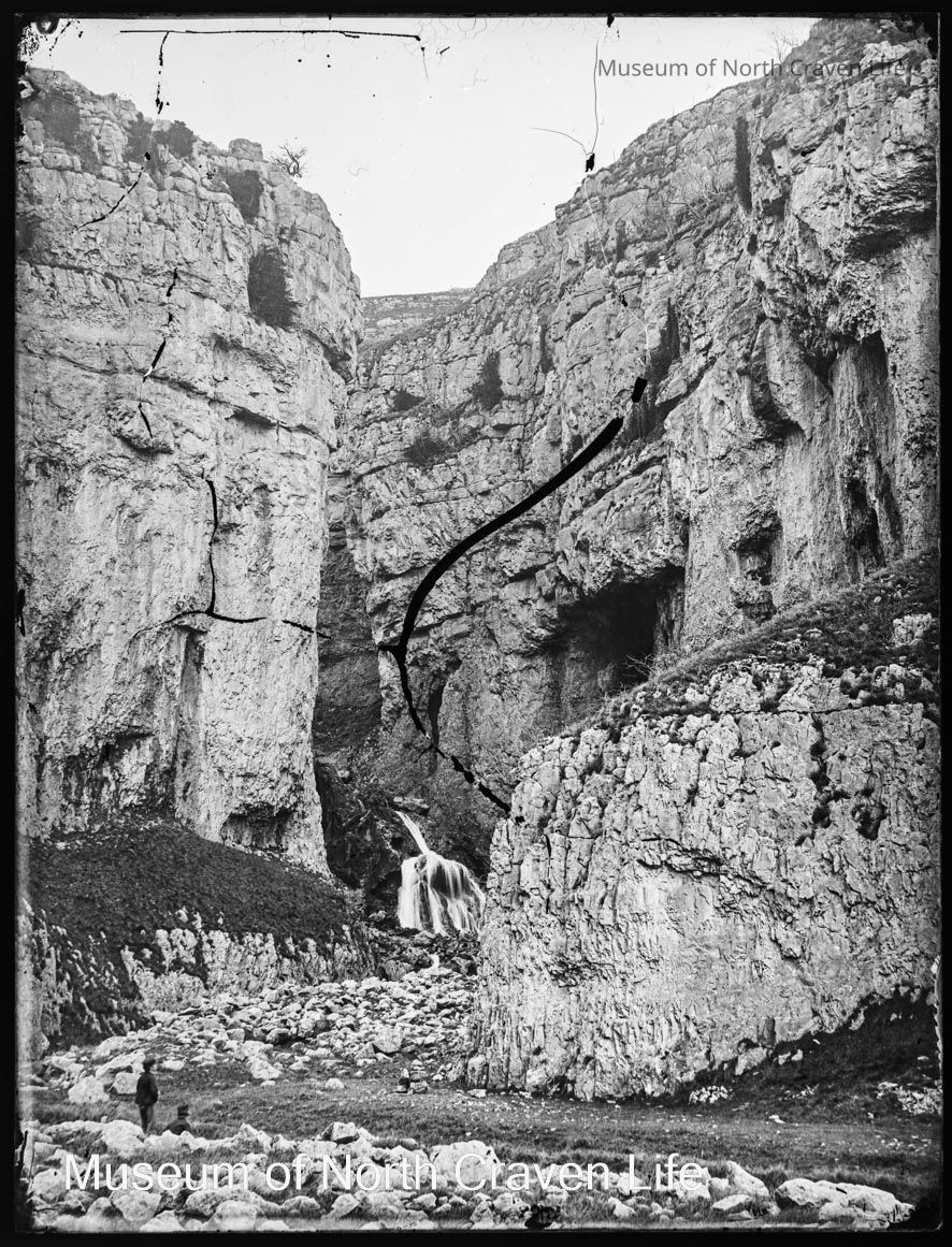 A full-plate wet collodion negative. View of Gordale Scar from below. Two figures stand in the left foregroundCollection