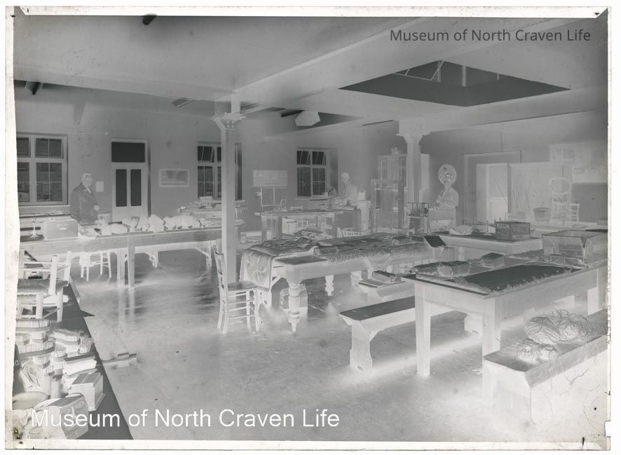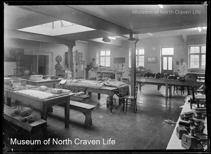 A gelatin silver acetate film negative.A workshop filled with brush heads and carpets. Three men stand at workbenches, dressed in white coatsCollection