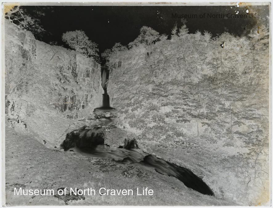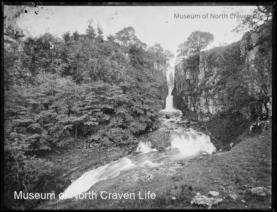 A full-plate gelatin silver glass negative. View of Catrigg Force from below, showing waterfalls and wooded slopes and limestone cliffsCollection
