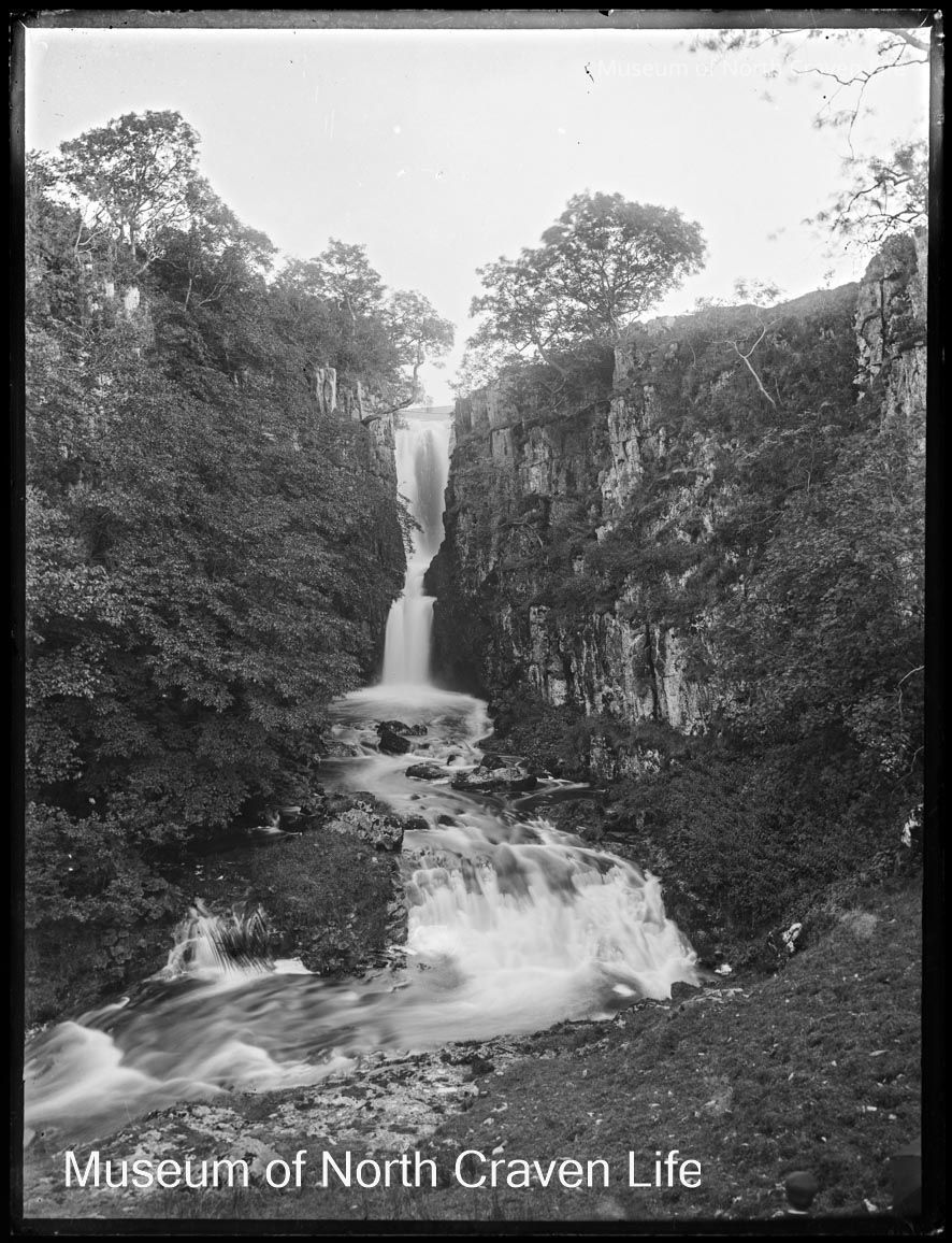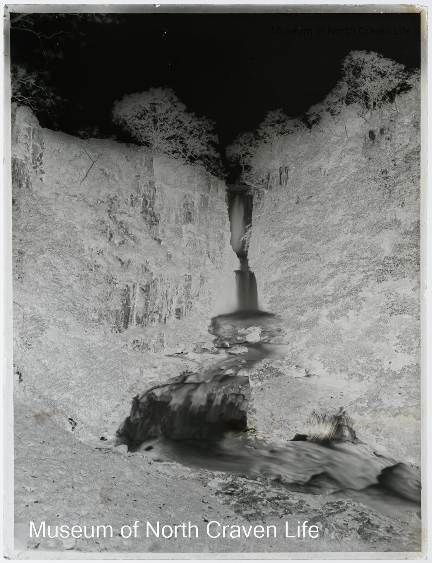 A full-plate gelatin silver glass negative. View of Catrigg Force from below, showing waterfalls and wooded slopes and limestone cliffsCollection