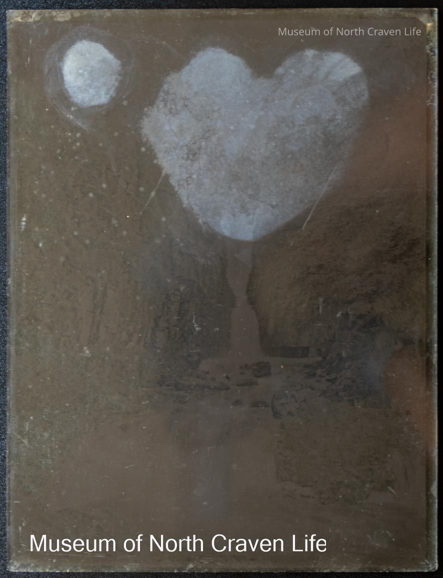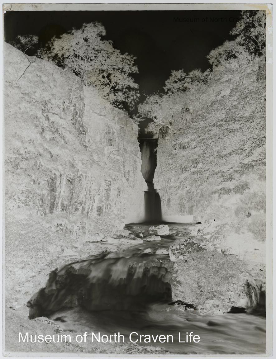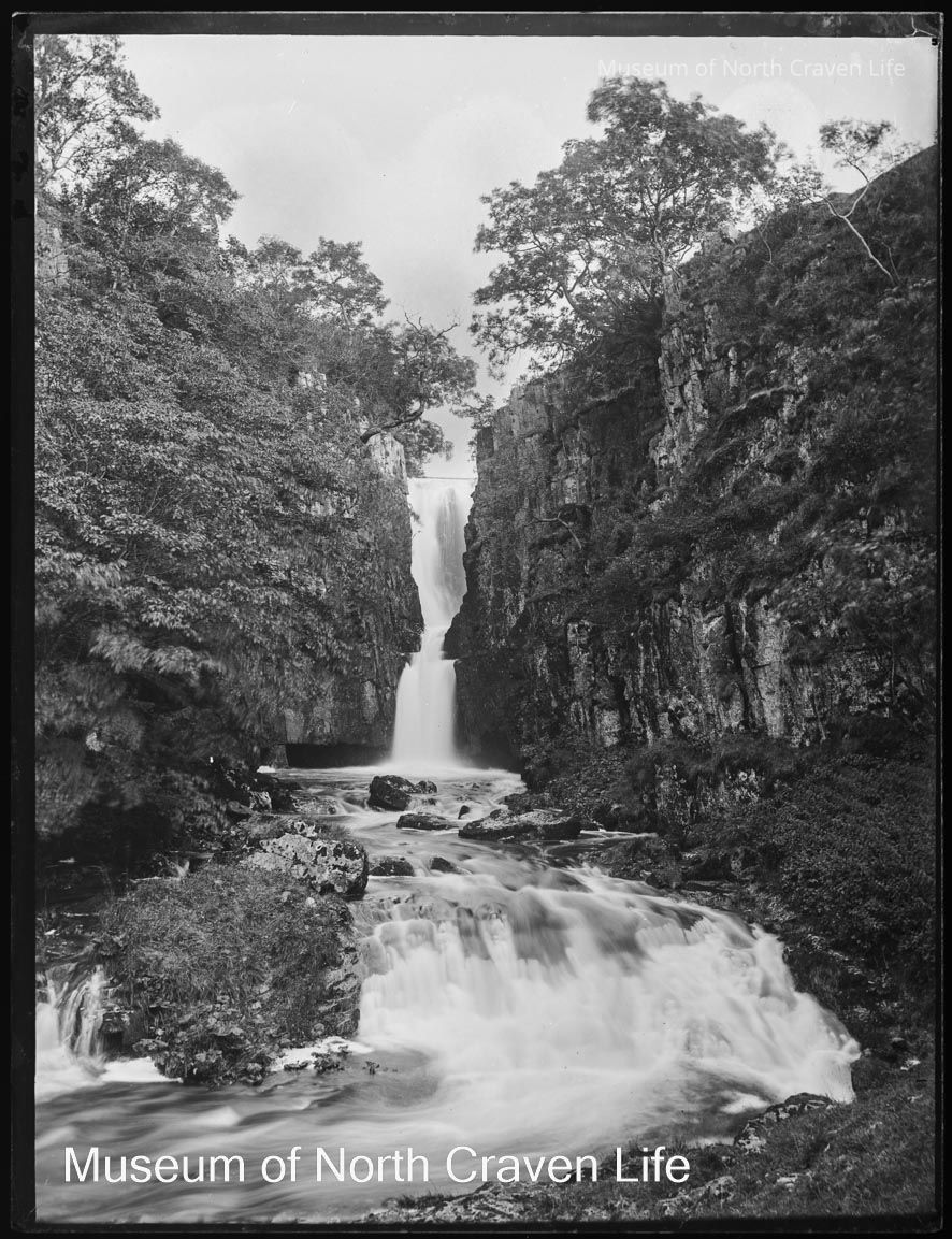 A full-plate gelatin silver glass negative. View of Catrigg Force from below, showing waterfalls and wooded slopes and limestone cliffsCollection