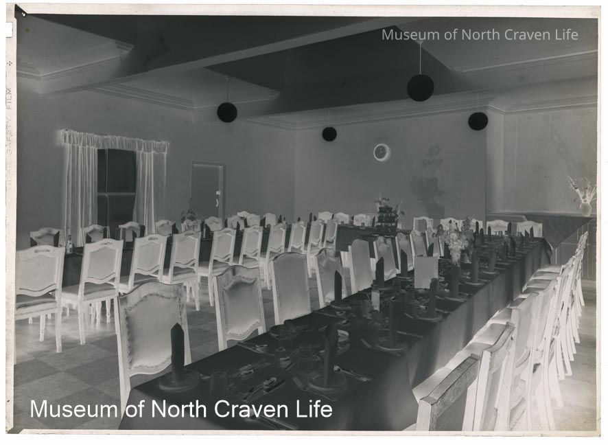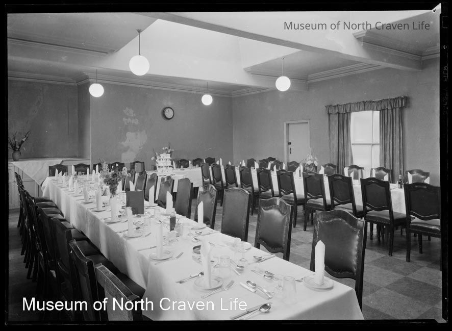 A gelatin silver acetate film negative. A view of the interior of the Ashfield Hotel (now Settle Social Club in Duke Street). A dining room with tables set for a mealCollection