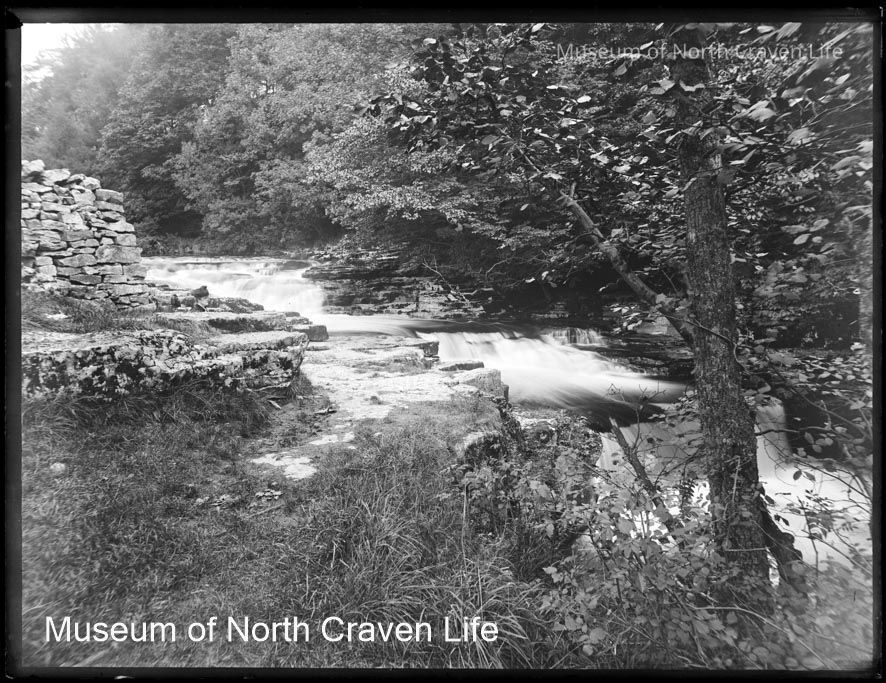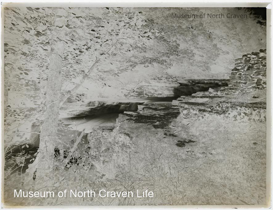 A full-plate gelatin silver glass negative. View of Stainforth Foss from river bank, with mature tree coverCollection
