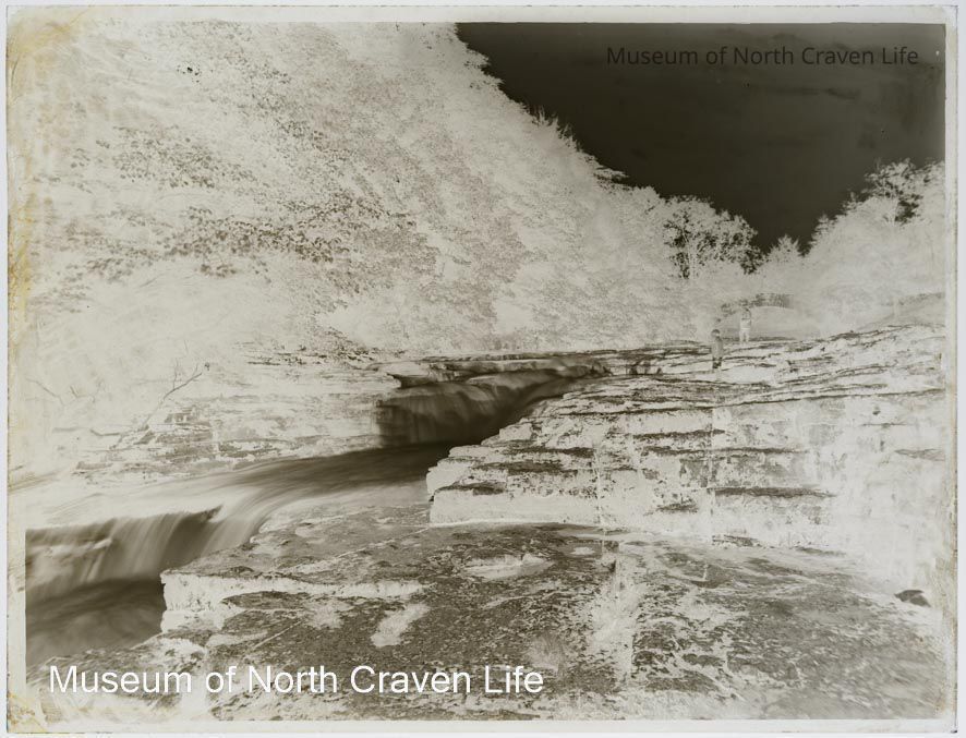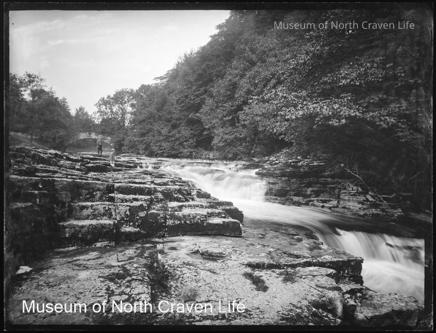 A full-plate gelatin silver glass negative. View of Stainforth Foss from river bank, with mature tree cover. Stainforth bridge in distanceCollection